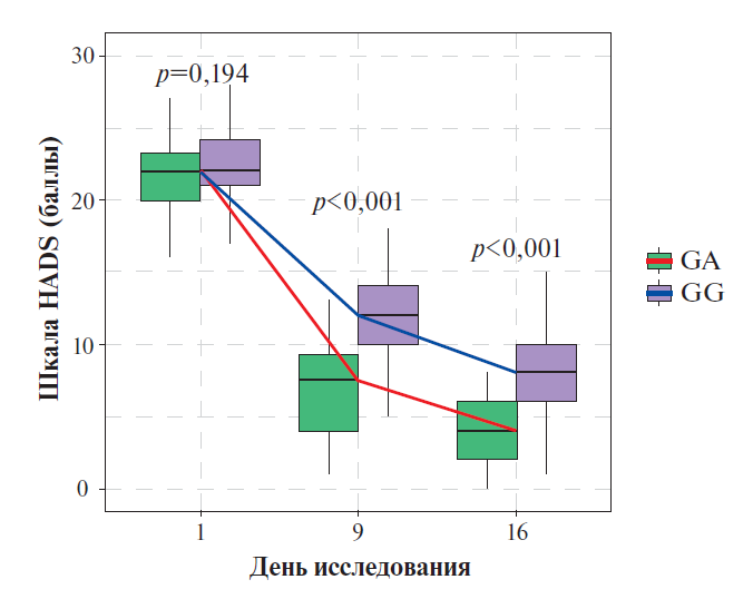 На рис. 1 представлено графическое отображение изменения суммарного балла по шкале депрессии Гамильтона (HAMD) у пациентов с разными генотипами. Как видно, на момент начала исследования сравниваемые группы были сопоставимы по изучаемому показателю: (GG) 13,0 [12, 0; 14, 0], (GA) 13,0 [12, 0; 13, 0], p=0,194. К 9-му дню исследования выраженность депрессивной симптоматики по шкале HAMD статистически значимо отличалась у пациентов с разными генотипами: (GG) 7,0 [6, 0; 8, 0], (GA) 4,0 [3, 8; 5, 0], p<0,001. Наличие различий сохранялось и на 16-й день: (GG) 5,0 [3, 0; 6, 0], (GA) 1,5 [0, 8; 3, 2], p<0,001. По другим психометрическим шкалам также наблюдалось наличие статистически значимой разницы у пациентов с разными генотипами по полиморфному маркеру 1846G>A гена CYP2D6 (rs3892097) на 9-й и 16-й дни исследования.