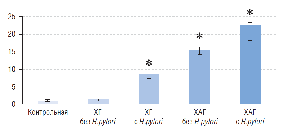 Примечание. * ― статистически значимые различия с контрольной группой. ХГ ― хронический гастрит, ХАГ ― хронический атрофический гастрит.