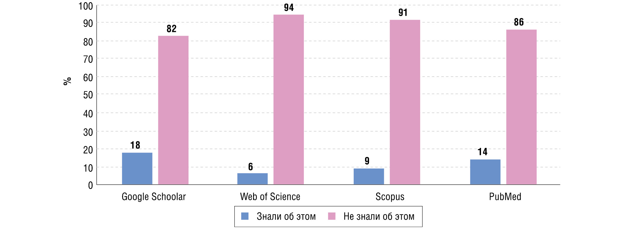 Современный научный мир базируется на постоянном и своевременном поиске информации, необходимой для понимания траектории развития того или иного научного направления и сопоставления собственных результатов исследования с мировыми тенденциями. Вопрос о знании наиболее популярных баз научной литературы показал, что о базе данных научных публикаций Google Scholar знают 18% респондентов и лишь 14% ― о наиболее емкой базе научной медицинской литературы PubMed. Об одной из наиболее полных баз данных Scopus знают только 9%, и 6% слышали о Web of Science (рис. 2).