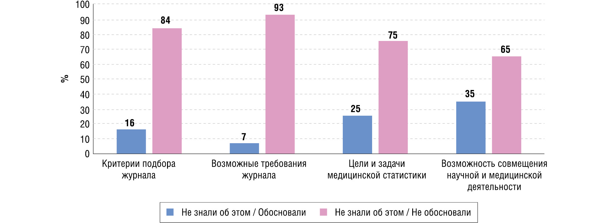 Отдельный блок вопросов был посвящен основам научной деятельности. Так, о критериях подбора журнала для публикации собственной статьи известно 16% респондентов. О возможных требованиях журнала к автору знают 7% опрошенных. Цели и задачи медицинской статистики как науки понятны 25% опрошенных. Обосновать важность совмещения научной и медицинской деятельности смогли 35% респондентов (рис. 4). Характеристика понятия «плагиат» была наиболее известным фактом ― 84% опрошенных школьников ответили на этот вопрос.