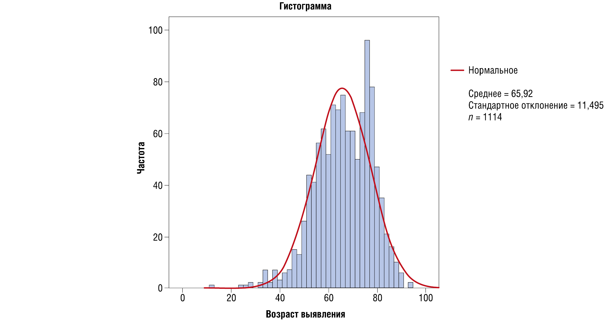 Средний возраст впервые выявленных пациентов раком пищевода и желудка составил 66 лет, М 65,92 (95 % ДИ 65,24−66,59), стандартное отклонение 11,495. Из 1114 случаев рака пищевода и желудка 5 пациентов были в возрасте до 30 лет, в том числе 1 — в возрасте 12 лет. Распределение пациентов с раком пищевода и желудка представлено на рис. 2.