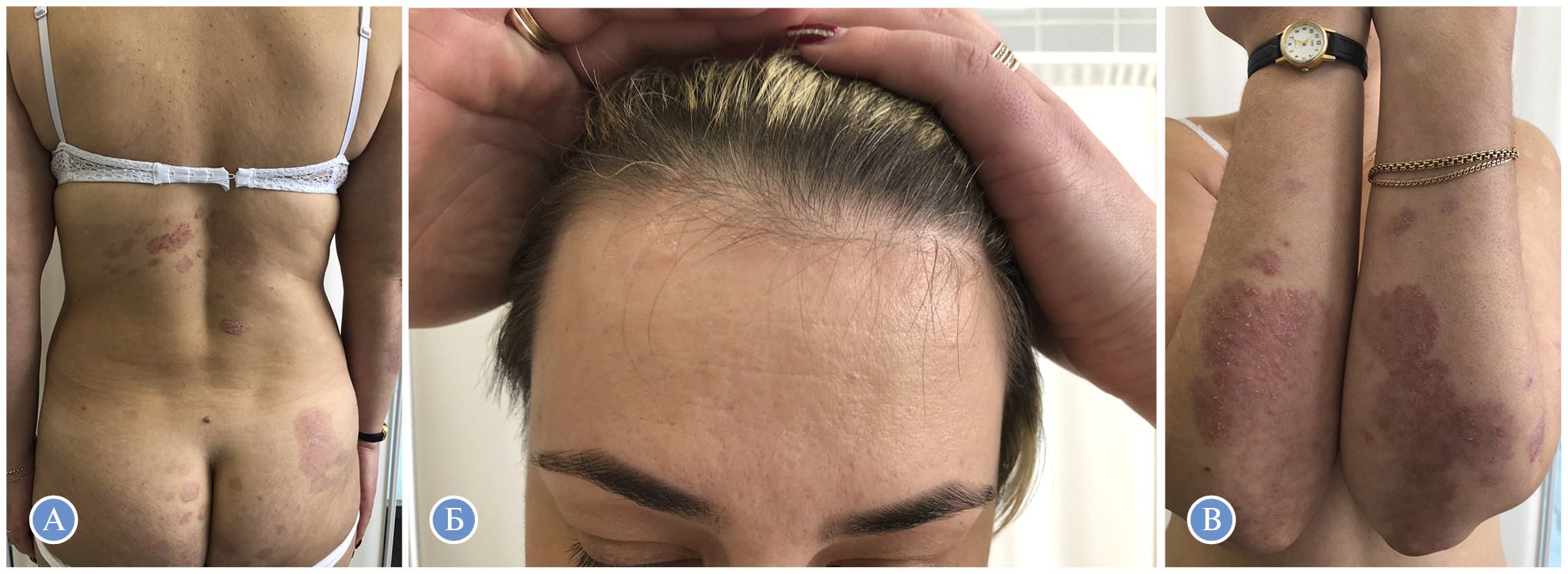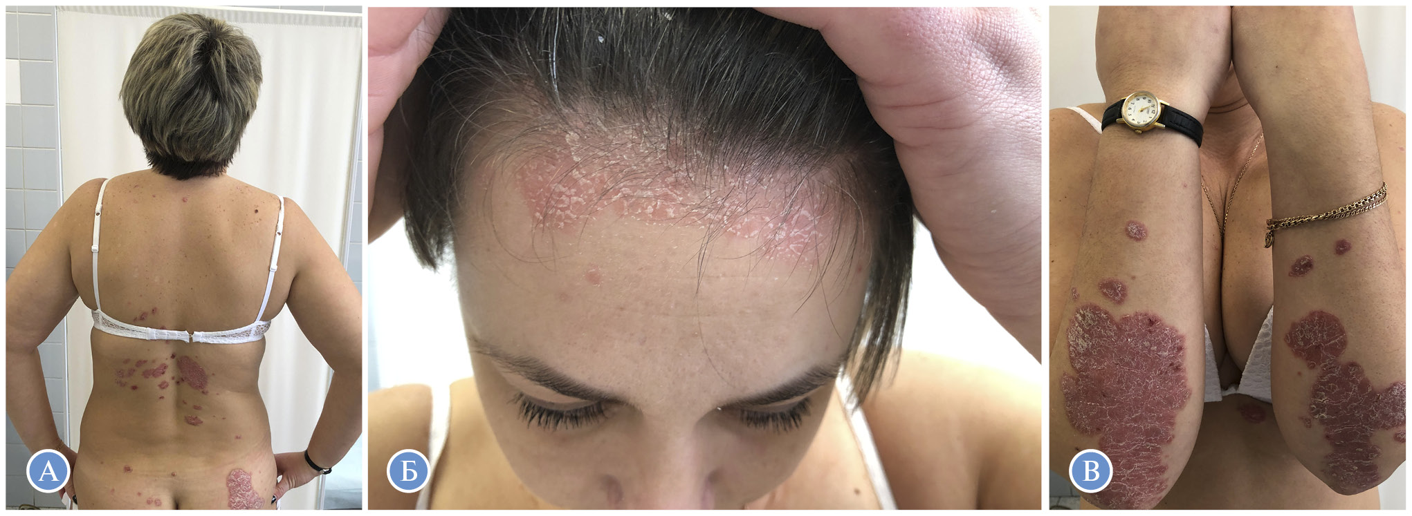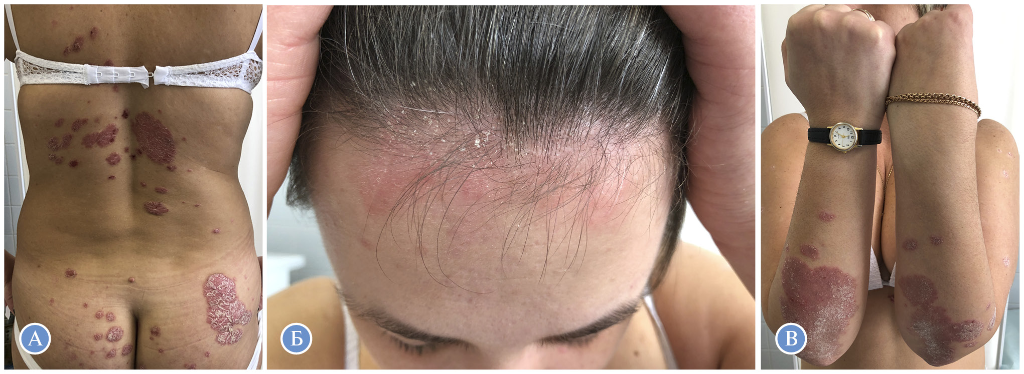 Рис. 1. Пациентка Ш., 31 год, с прогрессирующей стадией псориаза до начала терапии: высыпания на коже туловища (А), волосистой части головы (Б), верхних и нижних конечностей (В) представлены инфильтрированными папулами и бляшками ярко-розового цвета с мелкопластинчатым шелушением