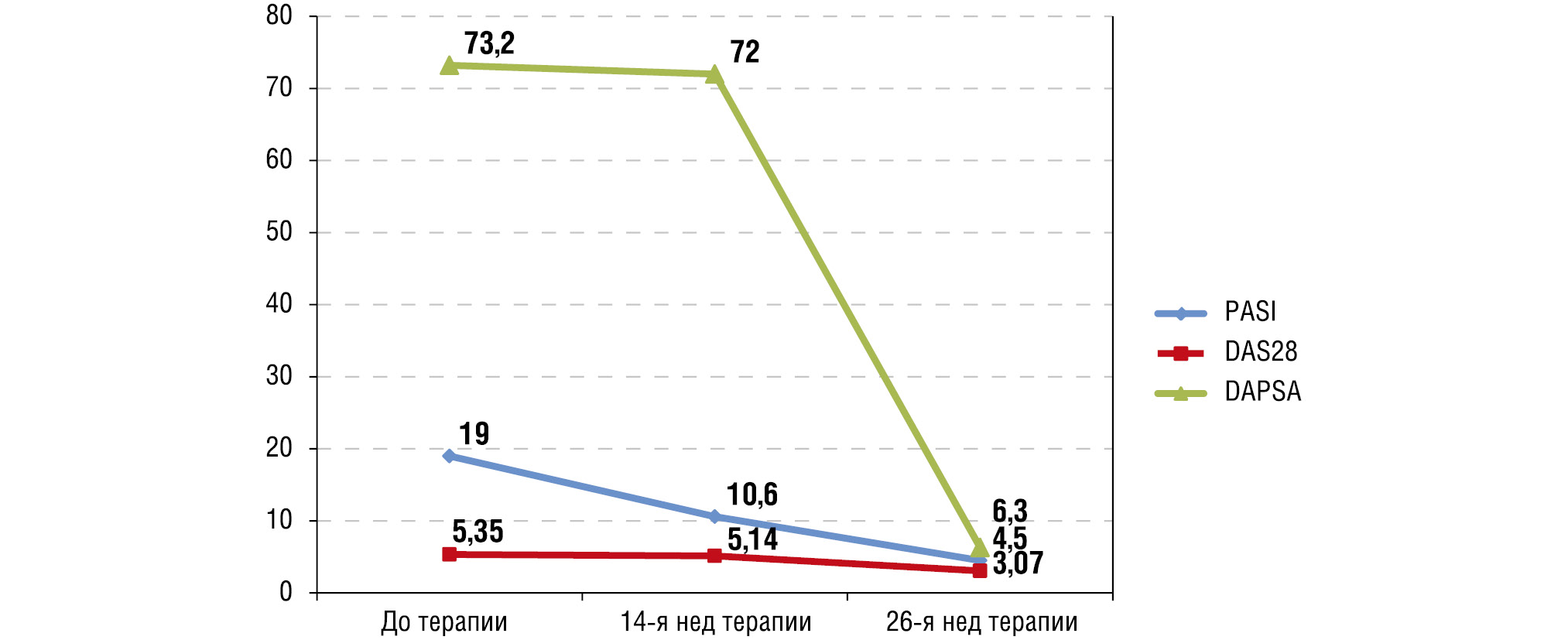 К 26-й нед терапии со стороны кожного процесса отмечалась выраженная положительная динамика в виде практически полного регресса высыпаний. Боль в суставах значительно уменьшилась, припухлости нет. При пальпации незначительная болезненность коленных и левого лучезапястного суставов. Достигнуты PASI 75 и низкая активность по DAS28 и DAPSA ― 3,07 и 6,3 соответственно (рис. 3, 4).