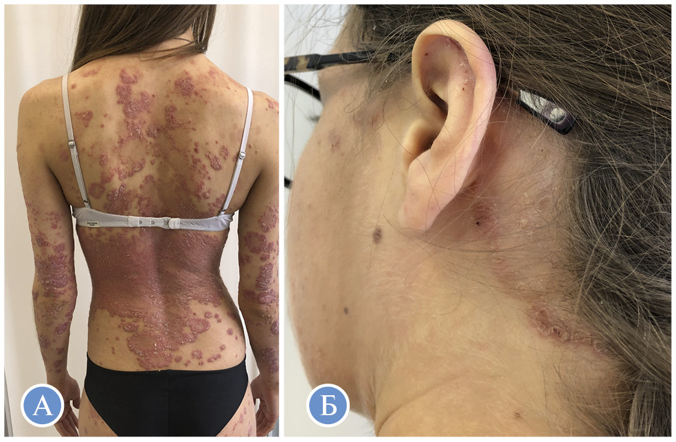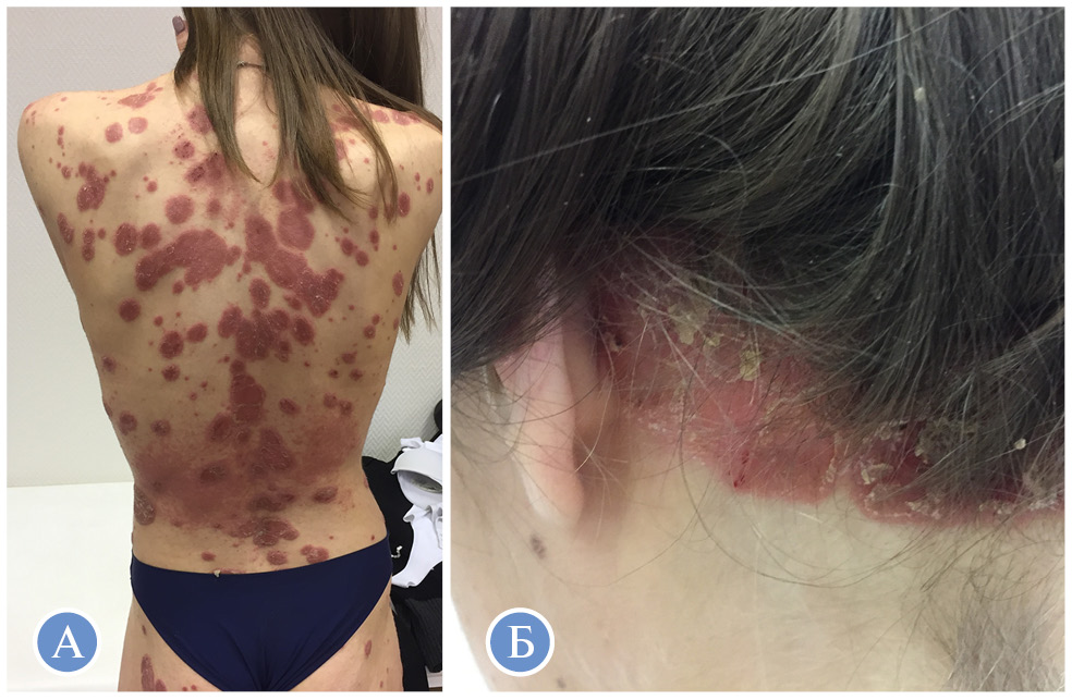 Рис. 5. Пациентка С., 25 лет, с прогрессирующей стадией псориаза до начала терапии: высыпания на коже туловища, верхних и нижних конечностей (А), волосистой части головы (Б) представлены папулами и бляшками ярко-красного цвета с выраженной инфильтрацией и умеренным мелкопластинчатым шелушением