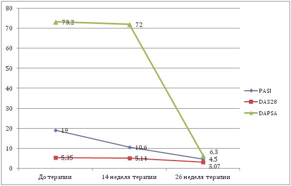 Рис. 7. Динамика индексов PASI, DAS28, DAPSA на фоне комбинированной терапии апремиластом и метотрексатом