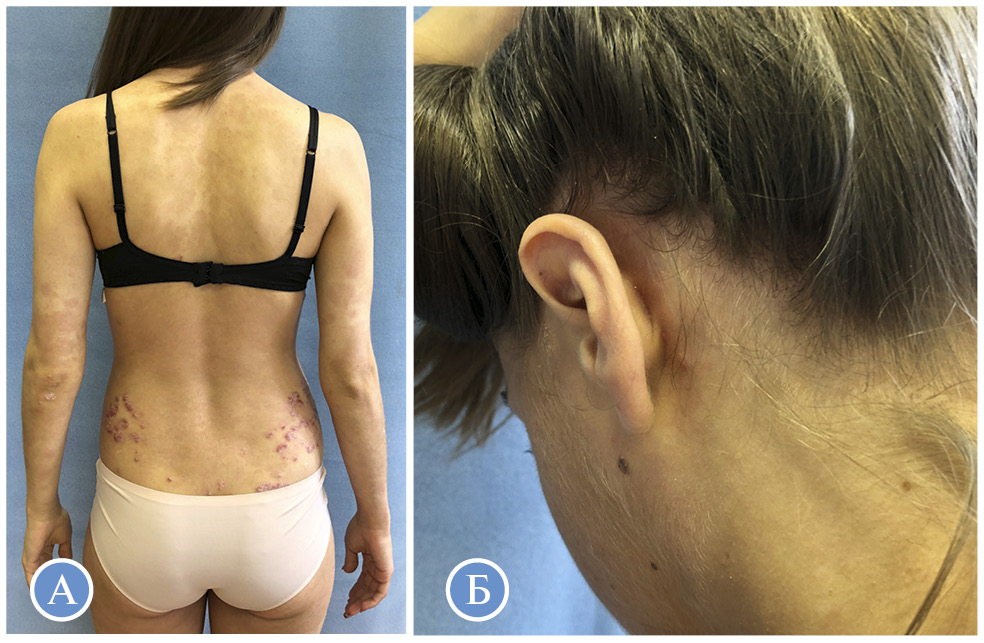 Рис. 6. Пациентка С., 25 лет, с прогрессирующей стадией псориаза через 14 нед монотерапии апремиластом: незначительная положительная динамика в виде уменьшения инфильтрации, эритемы и шелушения на коже туловища, верхних и нижних конечностей (А) и волосистой части головы (Б)