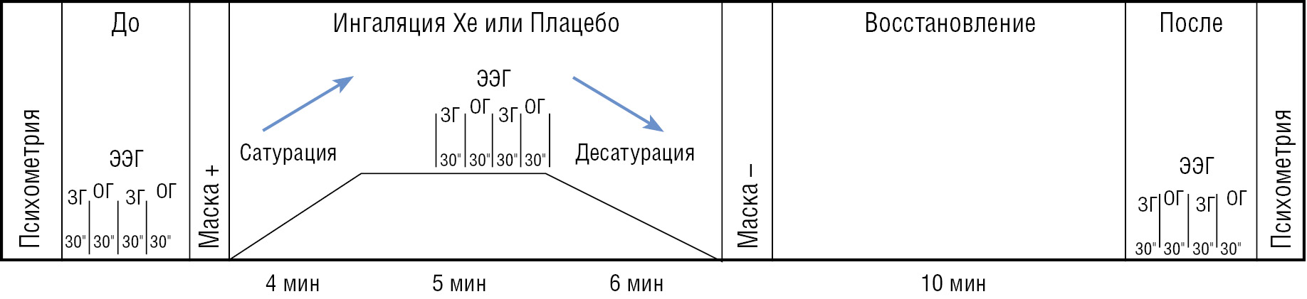 Примечание. Хе ― ксенон, «маска+/маска-» ― наложение/снятие анестезиологической маски; ЭЭГ ― электроэнцефалограмма, ЗГ/ОГ ― условия закрытых и открытых глаз.