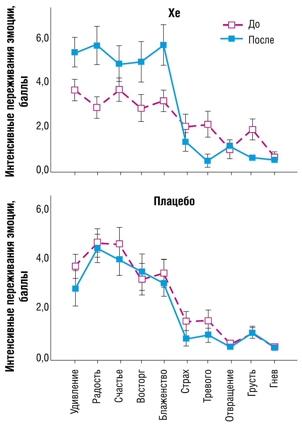 ANOVA показателей интенсивности переживания эмоции с факторами ГАЗ/2/ × Время/2/ × Эмоция /10/ установил основной эффект фактора ЭМОЦИЯ [F(9, 117) = 21,099; pG-G = 0,001], а также взаимодействий факторов ГАЗ × ВРЕМЯ [F(1,13) = 5,787; pG-G = 0,035] и ГАЗ × ВРЕМЯ × ЭМОЦИЯ [F(9,117) = 7,58; pG-G = 0,003]. Анализ средних взаимодействий 3-го порядка и данные множественных сравнений свидетельствуют, что ингаляция Xe по сравнению с плацебо приводит к избирательному усилению интенсивности положительных дискретных эмоций радости, счастья и блаженства (p ≤ 0,021) с тенденцией к снижению отрицательных эмоций, страха, тревоги и грусти (p ≤ 0,982) (рис. 2).