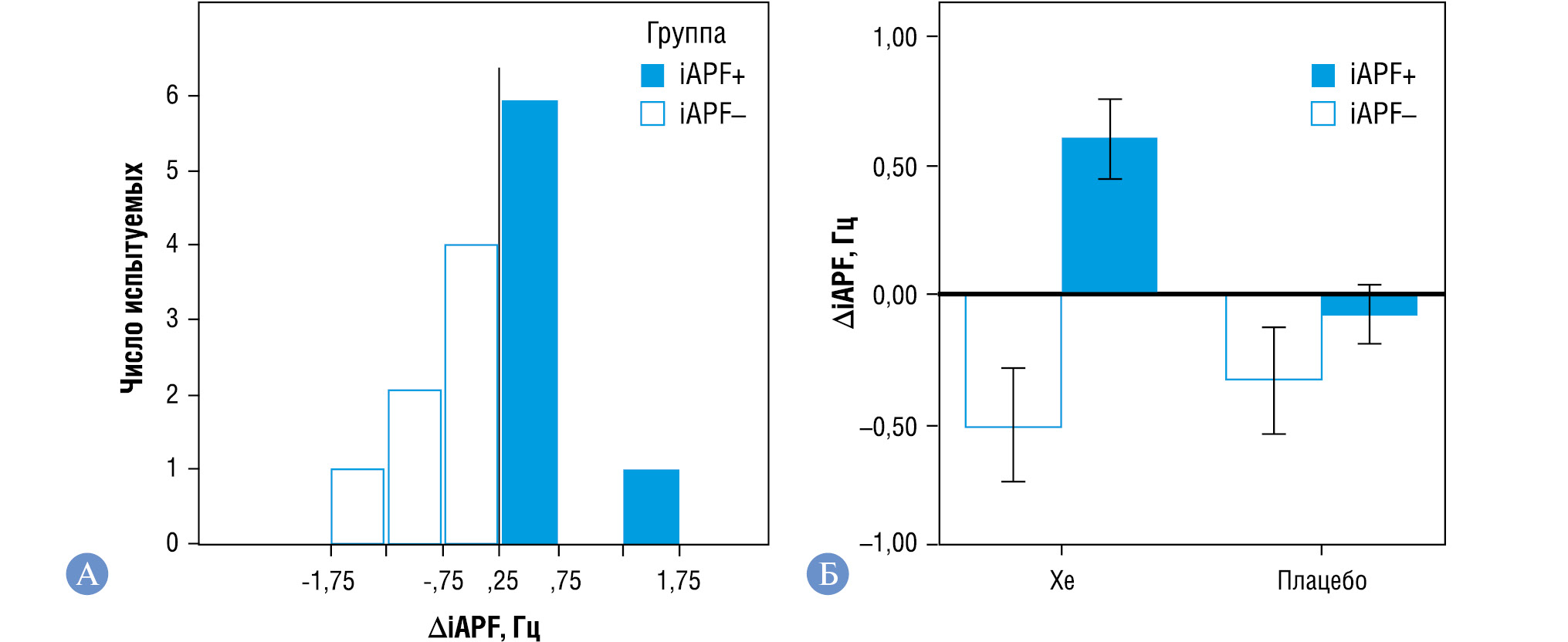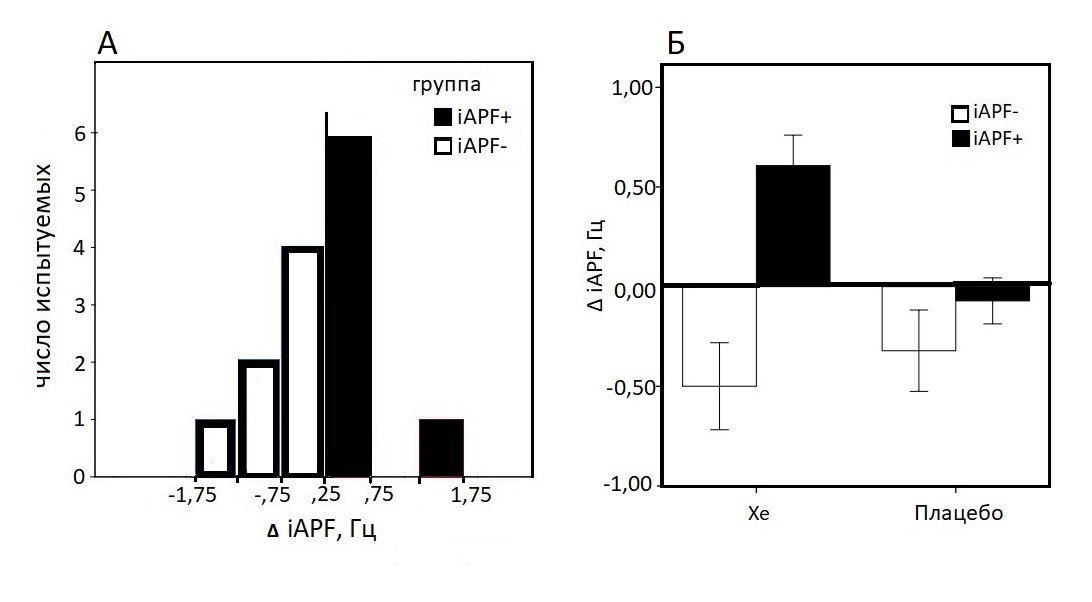 Анализ динамики индивидуальных значений iAPF выявил разнонаправленные эффекты Xe на данный показатель: у одной части испытуемых iAPF увеличились, а у другой ― снизились. Для дальнейшего анализа были сформированы подгруппы согласно медиане изменения частоты альфа-пика после ингаляции ксеноном (ΔiAPF), равной 0, 250 Гц: первая группа (iAPF-, n = 7) со средним значением MΔiAPF = -0,458 Гц и вторая (iAPF+, n = 7) со средним значением МΔIAPF = 0,678 Гц. На рис. 3А представлена гистограмма распределения изменений частоты альфа-пика после ингаляции Xe.