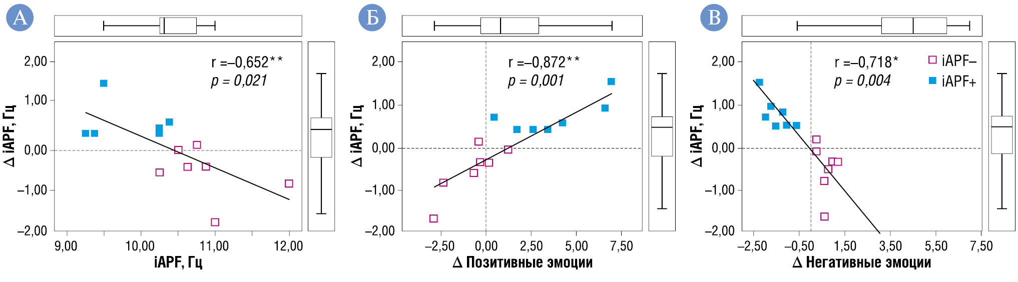 Рис. 5. Результаты корреляционного анализа взаимосвязи между сдвигом частоты альфа-пика (ΔiAPF) и значениями iAPF до ингаляции Хе (А), усредненной реактивностью переживания (Δ) положительных (Б) и Δ-негативных (В) эмоций после ингаляции Xe