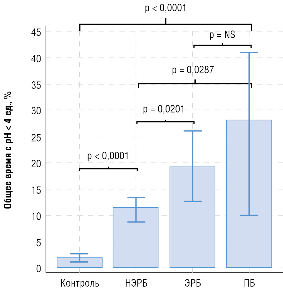 По данным суточной рН-импедансометрии, общее время с рН < 4 в пищеводе составило 1,9% (95% ДИ 1,1−2,7) у лиц контроля, 11,6% (95% ДИ 8,76−13,4) в группе пациентов с неэрозивной рефлюксной болезнью, 19,35% (95% ДИ 12,70−26,05) в группе эрозивной рефлюксной болезни и с наибольшими значениями у больных пищеводом Барретта ― 28% (95% ДИ 10,04−40,96) (рис. 1).