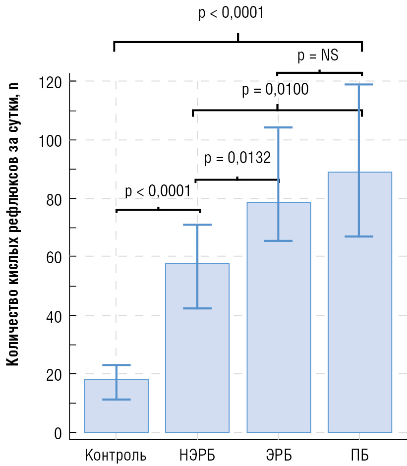 Среднее количество кислых рефлюксов составило 18,0 (95% ДИ 10,99−23,0) у лиц контроля, 58,0 (95% ДИ 42,34−71,0) у пациентов с неэрозивной рефлюксной болезнью, 78,5 у больных эрозивной рефлюксной болезни (95% ДИ 65,34−103,93) и также с наибольшими значениями в группе пациентов с пищеводом Барретта ― 89,0 (95% ДИ 67,03−118,72) (рис. 2). Статистически достоверные различия в исследуемых показателях были отмечены при сравнении пациентов с пищеводом Барретта и лицами контроля, а также группой неэрозивной рефлюксной болезни.