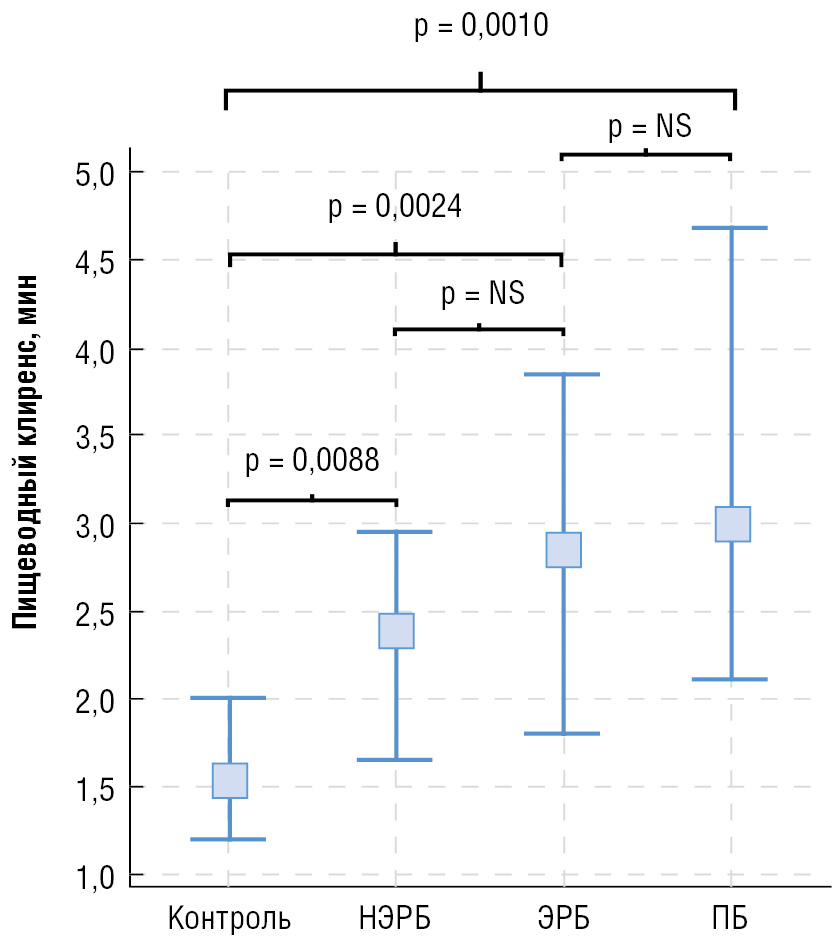 Медиана времени химического клиренса составила 1,55 мин (95% ДИ 1,19−2,0) у лиц контроля и увеличивалась по мере возрастания тяжести заболевания пищевода: 2,4 мин (95% ДИ 1,65−2,94) при неэрозивной рефлюксной болезни, 2,85 мин (95% ДИ 1,80−3,84) при эрозивной рефлюксной болезни и 3 мин (95% ДИ 2,1−4,68) у пациентов с пищеводом Барретта (рис. 4).