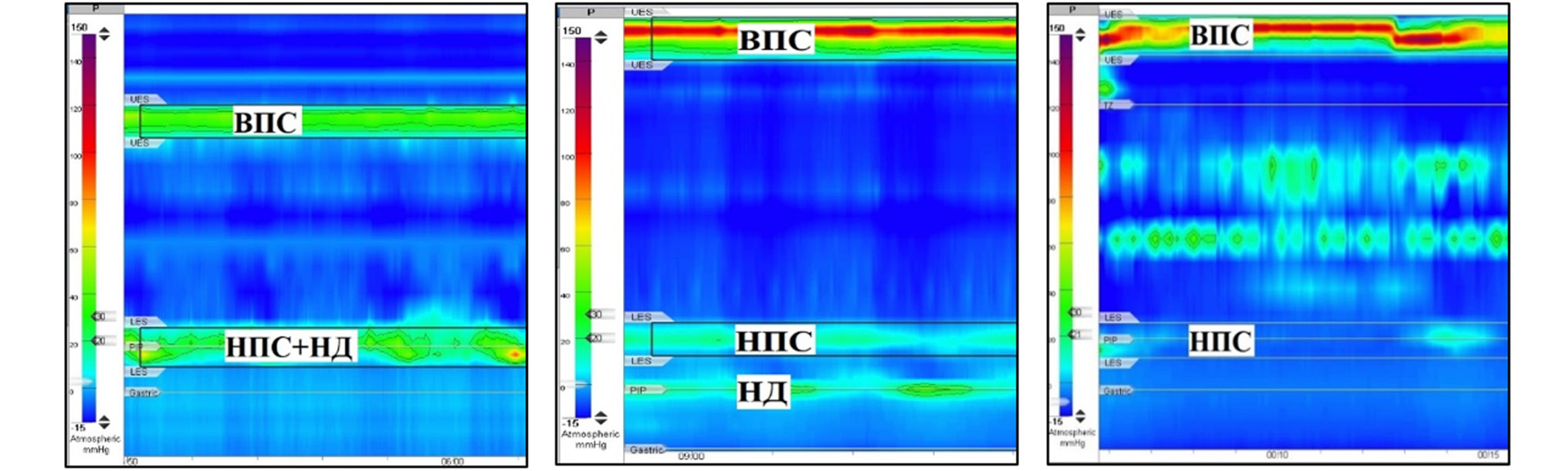 Примечание. А ― нормальная структура ПЖП: ПЖП представлен единой зоной давления, включающей НПС и НД. Б ― нарушение структуры ПЖП: ПЖП представлен двумя зонами давления (верхняя ― давление НПС, нижняя ― давление НД), что соответствует грыже пищеводного отверстия диафрагмы. В ― гипотония НПС: давление покоя НПС 4 мм рт.ст. (норма 10−45). ВПС ― верхний пищеводный сфинктер, НПС ― нижний пищеводный сфинктер, НД ― ножки диафрагмы, ПЖП ― пищеводно-желудочный переход.