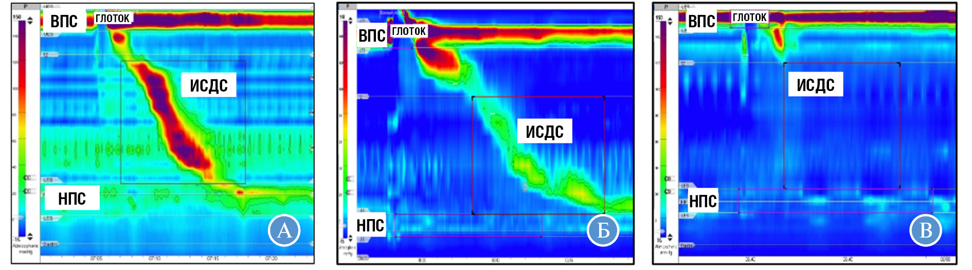 Примечание. А ― нормальная моторика: ИСДС 2769 мм рт.ст. × см × сек (норма 450−8000). Б ― неэффективная моторика: ИСДС 360 мм рт.ст. × см × сек (норма 450−8000) ― ослабленная перистальтика. В ― отсутствие сократимости: ИСДС 0 мм рт.ст. × см × сек (норма 450−8000). ВПС ― верхний пищеводный сфинктер; НПС ― нижний пищеводный сфинктер; ИСДС ― интегральная сократимость дистального сегмента.