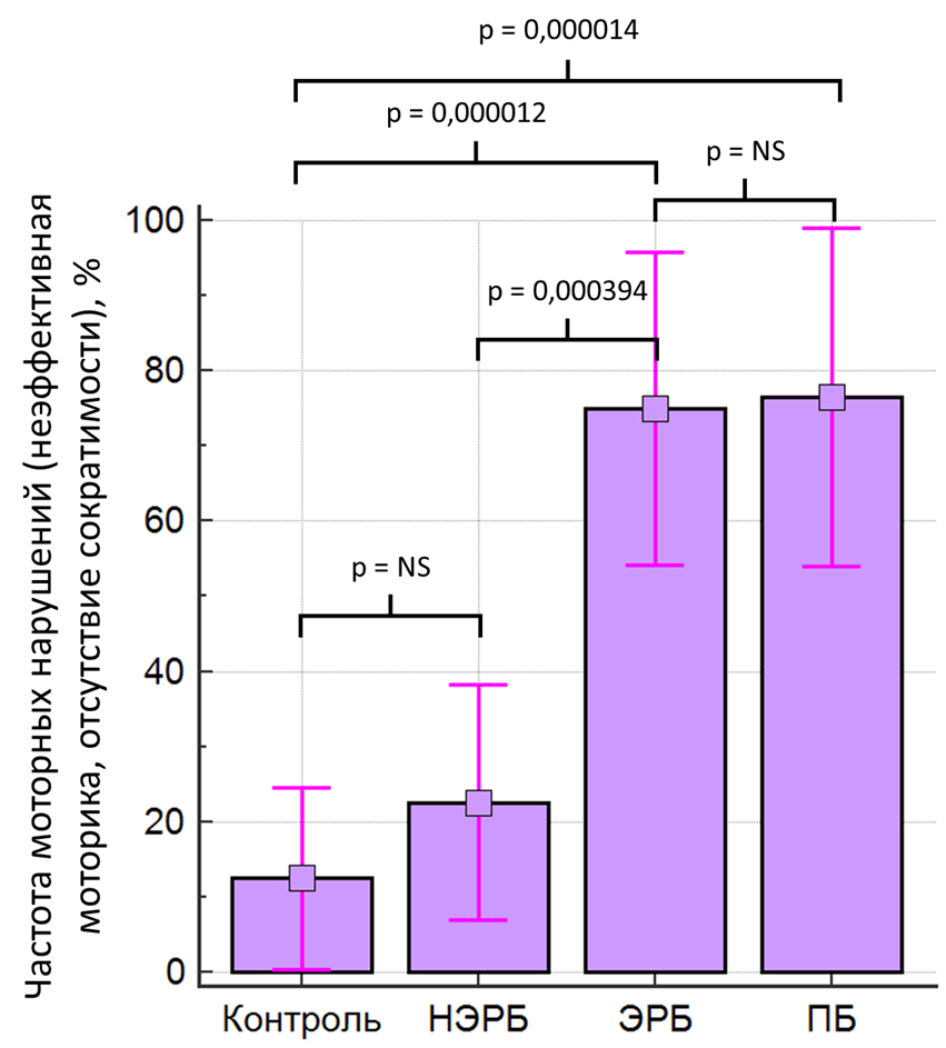 При оценке двигательной функции грудного отдела пищевода нами было отмечено, что моторные нарушения у лиц контроля и пациентов с неэрозивной рефлюксной болезнью встречаются достоверно реже, чем в группах с эрозивной рефлюксной болезнью и пищеводом Барретта. Наиболее частым моторным расстройством в целом являлась неэффективная моторика пищевода, характеризующаяся снижением интенсивности сокращения грудного отдела пищевода на ≥ 50% глотков [23]. Данное нарушение моторики значительно преобладало в группах пациентов с эрозивной рефлюксной болезнью и пищеводом Барретта по сравнению с лицами контроля и пациентами с неэрозивной рефлюксной болезнью. Кроме того, у пациентов с пищеводом Барретта в 28% случаев выявлялось отсутствие сократимости грудного отдела пищевода, что относится к тяжелым моторным расстройствам [23]. В исследовании C. Bazin и соавт. [12] также было отмечено, что моторные расстройства грудного отдела пищевода достоверно чаще выявлялись в группе с пищеводом Барретта по сравнению с группой пациентов ГЭРБ.