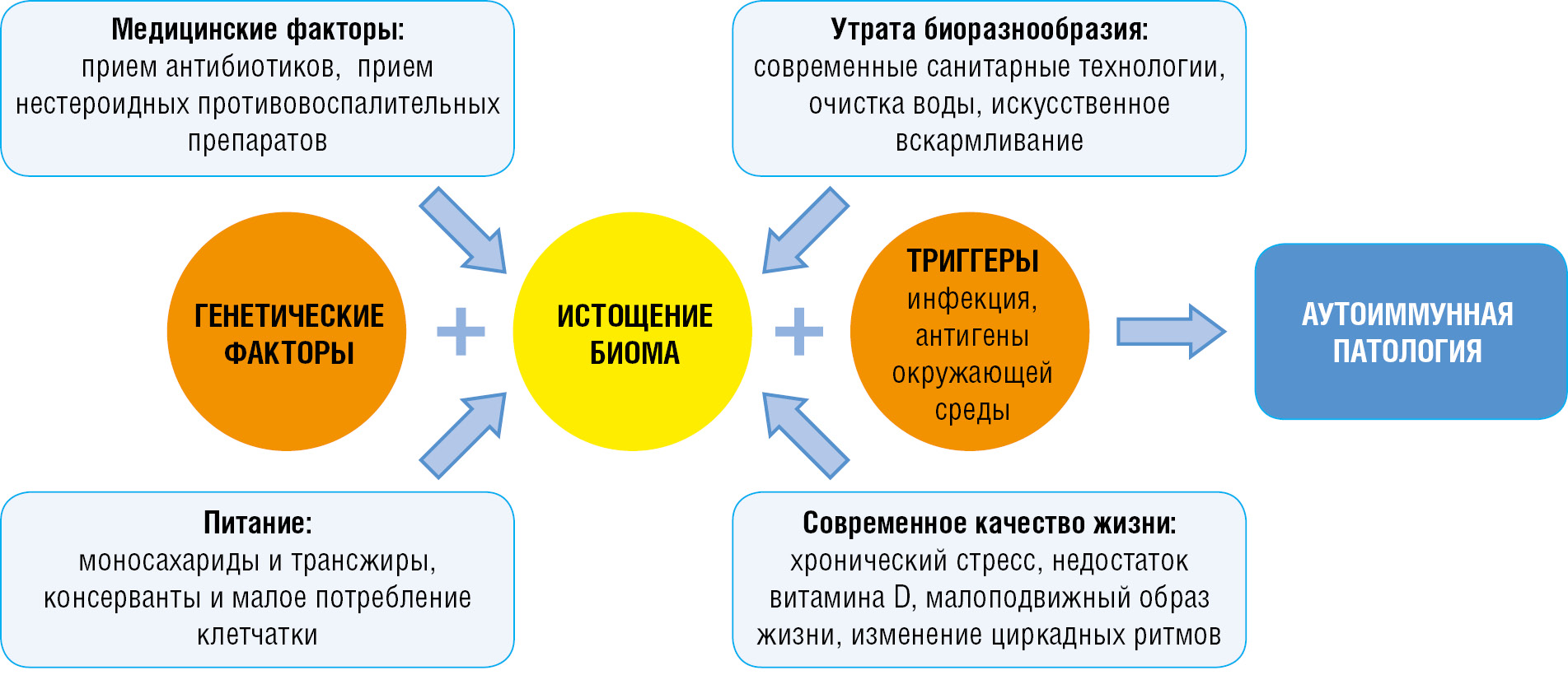 За последние столетия состав кишечной микробиоты претерпел существенные изменения. Становление микробиоты человечества связано с развитием сельского хозяйства (употреблением молока и кисломолочных продуктов, круп, хлеба), урбанизацией, увеличением численности и плотности населения и, как следствие, ростом инфекционной патологии. Потребность в эффективных методах обеззараживания воды, централизованном водоснабжении отразилась на составе микробного пейзажа человека [25]. Другим значимым периодом, который повлиял на качественный и количественный состав микробиоты кишечника, стала промышленная революция — изменение подходов к питанию, быстрая ликвидация бактерий с помощью антибиотиков и современных средств гигиены [26]. Кроме того, в эпоху постиндустриального общества значимыми факторами качества жизни современного человека стало длительное пребывание в помещениях и, соответственно, недостаток витамина D [27], малоподвижный образ жизни также вносит свой вклад в увеличение распространенности иммунноопосредованных заболеваний. Очевидно, что указанные факторы влияют на микробиоту, которая, в свою очередь, сказывается на функции иммунной системы, что приводит к росту аутоиммунных заболеваний.