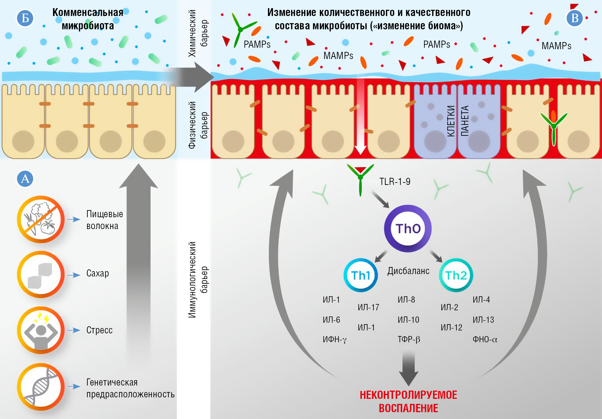 В норме барьерная функция кишечника (Б) определяется состоянием плотных контактов эпителия, а также количеством и качеством муцина, защищающего эпителий. При ЯК комбинация генетических факторов и определенных факторов окружающей среды (А), обусловливающих повреждение структуры микробиоты кишечника и нарушение проницаемости слизистой оболочки кишки, влечет ухудшение барьерной функции кишечника (В). Первая линия иммунной защиты направлена на недопущение проникновения антигенов в слизистую оболочку и элиминацию чужеродных антигенов с последующей активацией антигенспецифического иммунного ответа. Врожденный иммунитет обеспечивает ответ через распознавание патоген- и микроб-ассоциированных молекулярных структур (PAMP, МАМР) и приводит к активации приобретенного иммунитета. Двумя главными системами паттерн-распознающих рецепторов являются Toll-подобные рецепторы (TLR) и молекулы NOD. При ВЗК в толстой кишке обнаруживаются клетки Панета как следствие повышенной потребности в противомикробной защите. В норме эти клетки присутствуют только в тонкой кишке. После презентации антигенов Т-хелперам и макрофагам происходит трансформация наивных Т-хелперов (Th0) в Т-хелперы первого и второго типа (Th1, Th2). Трансформация в Th1 сопровождается выработкой провоспалительных цитокинов, дифференцировка в Th2 способствует выработке противовоспалительных цитокинов. Многочисленные исследования последних лет свидетельствуют о значимости дисрегуляции иммунного ответа на эндогенные бактерии желудочно-кишечного тракта.