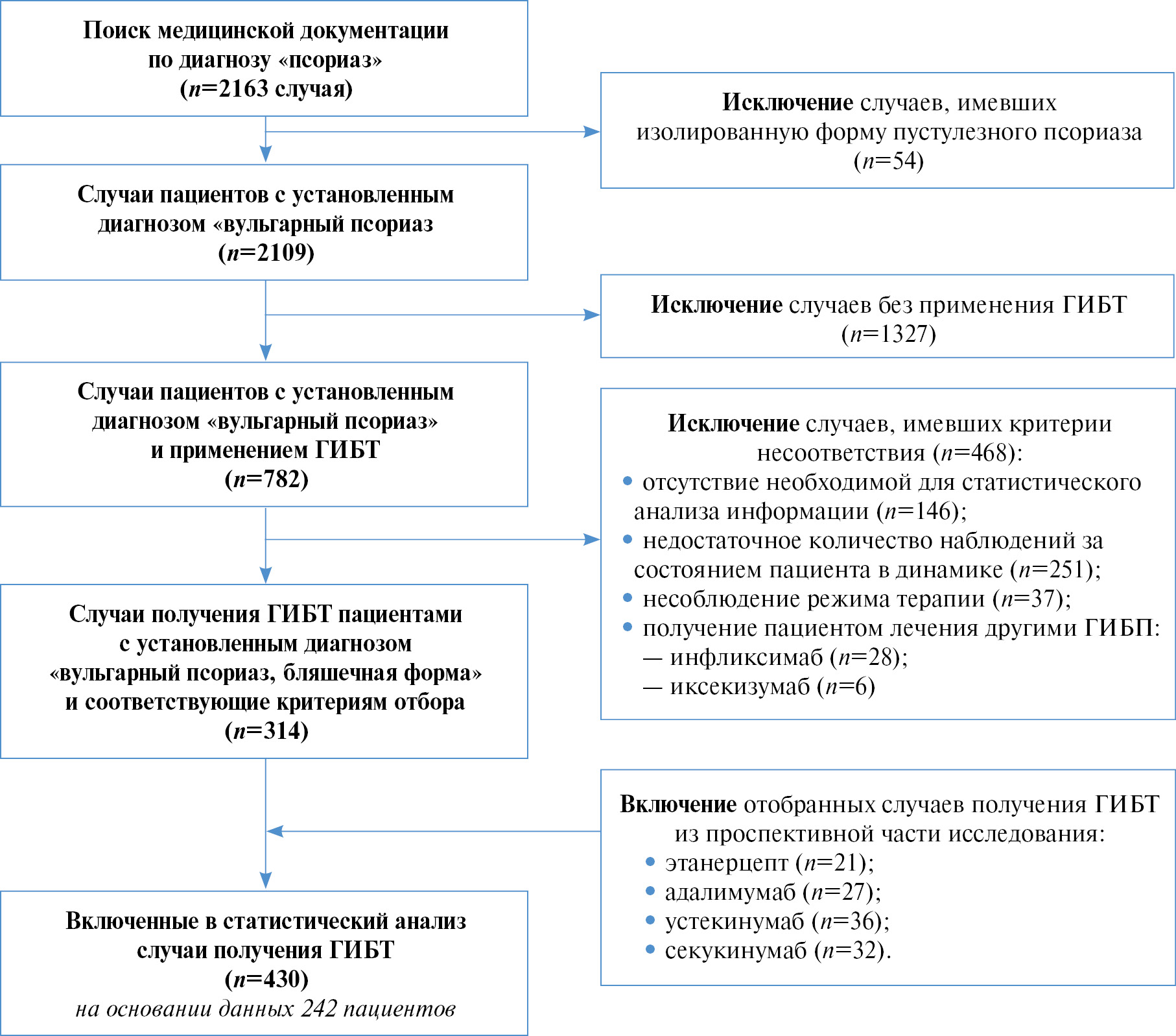 Исследование включало ретроспективные и проспективные данные наблюдения за пациентами, полученные за 8-летний период (с 2015 по 2023 г.). Наблюдение за пациентом проводилось от момента инициации до отмены ГИБП, не было установлено конкретных временных рамок продолжительности периода включения, обязательным условием являлось периодическое наблюдение за пациентом или получение сведений о состоянии (общего здоровья и патологического процесса — тяжести вульгарного псориаза) каждые 3–6 мес для отслеживания исходов ГИБТ.