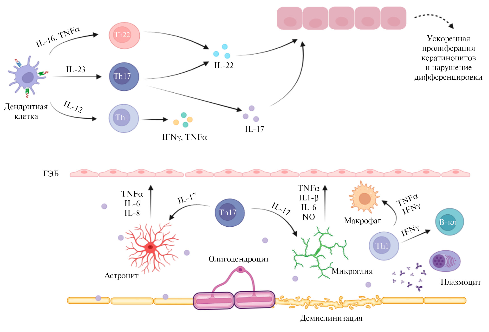 Патологический процесс запускается с презентации антигена дендритным клеткам, затем они передают сигнал Т-клеткам, а те, в свою очередь, дифференцируются в различные популяции и начинают секретировать ИЛ-12 и ИЛ-23 (рис. 1). В результате происходит образование аутореактивных Th-1 и Th-17. Th-17 индуцирует тканевое воспаление с помощью выработки ИЛ-17А, что приводит к нарушению дифференцировки кератиноцитов, а также демиелинизации.