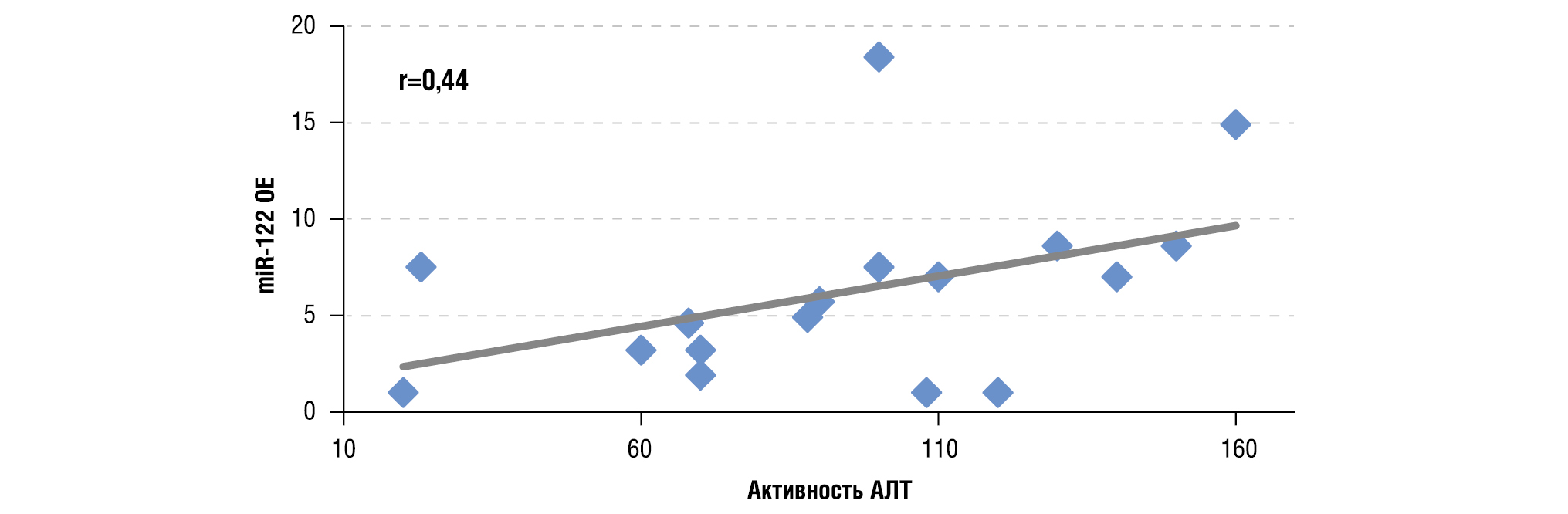 Рис. 2. Корреляция активности аланинаминотрансферазы (АЛТ) с уровнем miR-122 крови при хроническом гепатите С (n = 17)