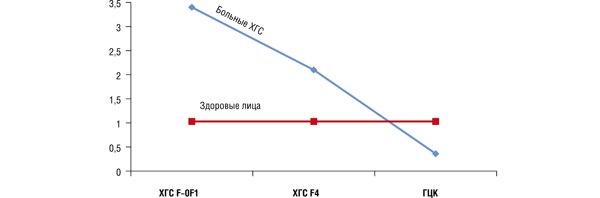 Показатель | ОГС | ХГС (F0−F1) | ХГС (F4) | ГЦК | ЦПНЭ | Здоровые лица |
