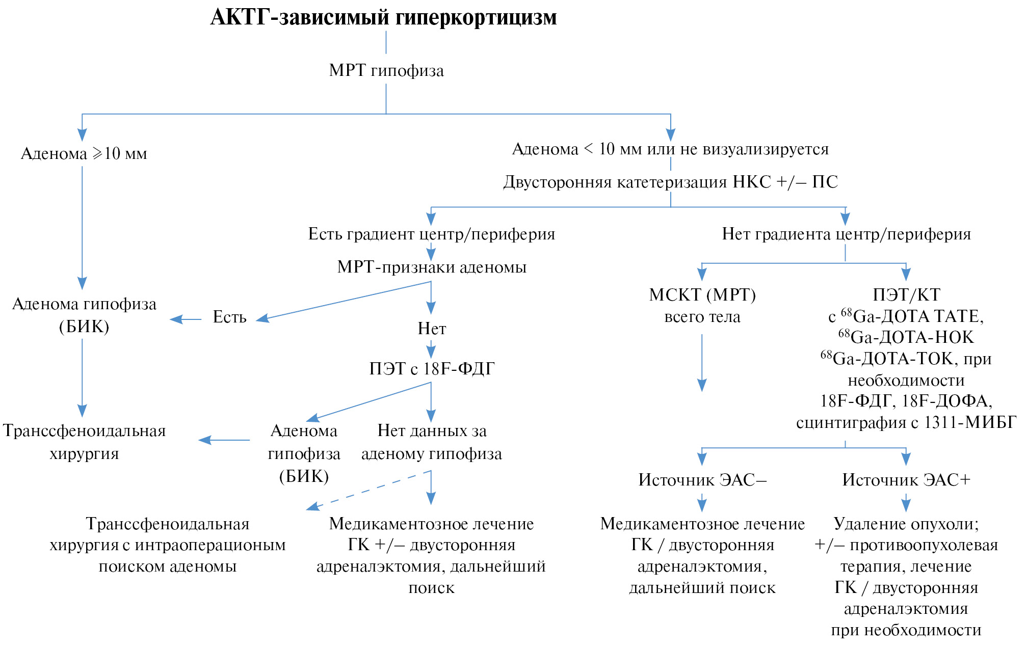 Примечание. АКТГ — адренокортикотропный гормон; МРТ — магнитно-резонансная томография; НКС — нижний каменистый синус; ПС — пещеристый синус; МСКТ — мультиспиральная компьютерная томография; ПЭТ/КТ — позитронно-эмиссионная томография, совмещенная с компьютерной томографией; 68Ga-ДОТА ТАТЕ, 68Ga-ДОТА-НОК, 68Ga-ДОТА-ТOK-DOTA — конъюгированные лиганды (пептиды); 18F-ФДГ, 18F — фтордезоксиглюкоза; 18F-ДОФА — 18F-фтор-L-дигидроксифенилаланин; сцинтиграфия с 131I-МИБГ; БИК — болезнь Иценка–Кушинга; ГК — гиперкортицизм.