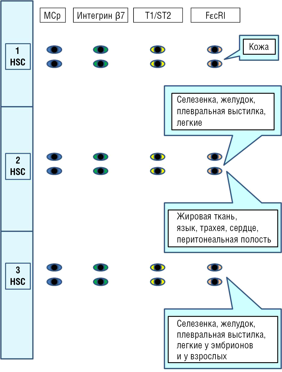 Рис. 1. Схема происхождения тучных клеток по Z. Li et al. (2018): 1–3 — HSC — стволовые клетки основных эмбриональных периодов: 1 — эритро-миелоидные, 2 — печеночные, 3 — костномозговые; МСр — коммитированные предшественники тучных клеток; интегрин β7, T1/ST2 и FεcRI — маркеры тучных клеток соответствующих эмбриональных периодов.