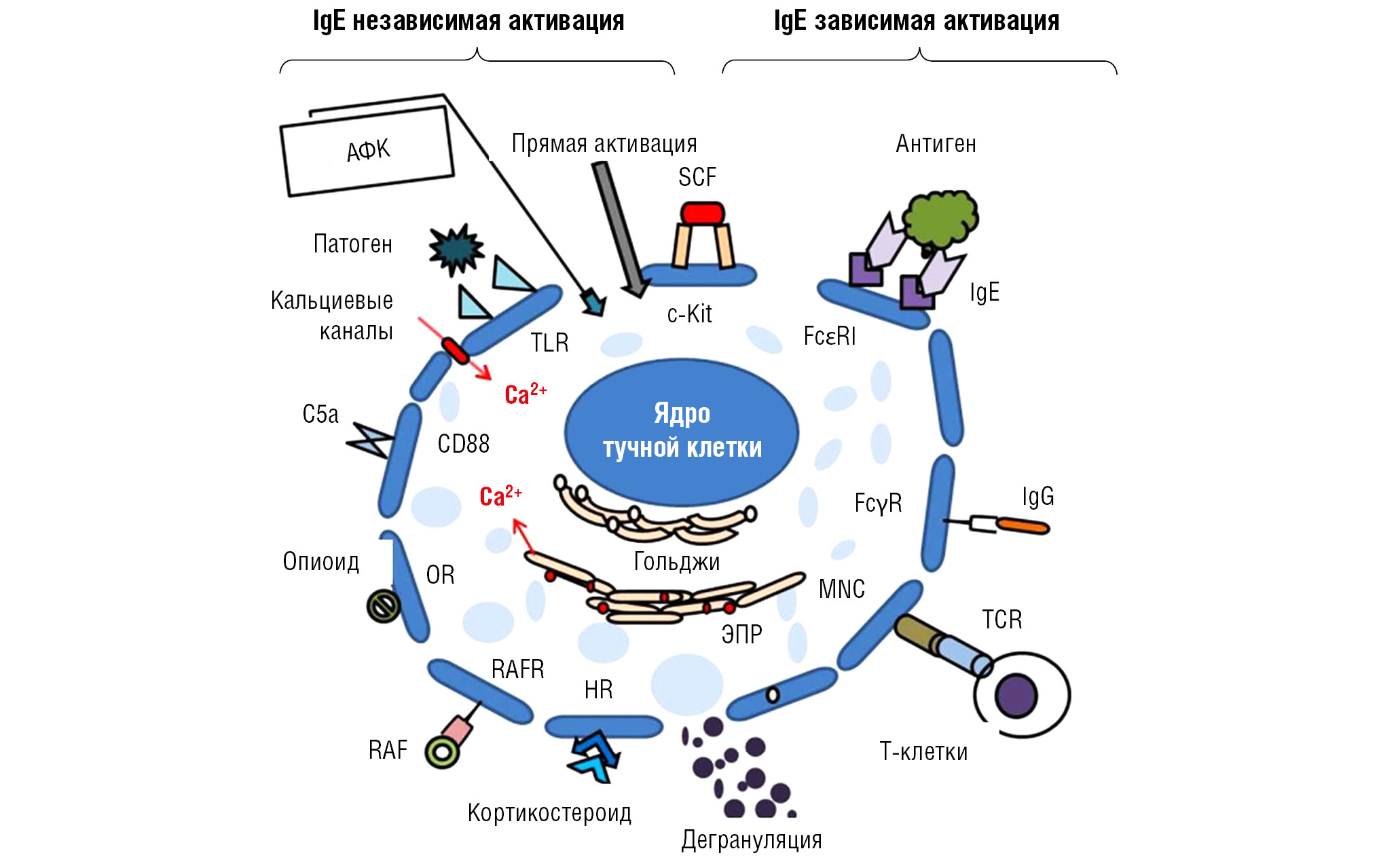 Тучные клетки (ТК, мастоциты, лаброциты) — многофункциональная, диффузная, очень широко распространенная в организме животных и человека популяция долгоживущих клеток, которая выполняет многие гомео-статические функции. Благодаря большому разнообразию своих рецепторов ТК селективно реагируют на различные типы раздражителей окружающей микросреды и всего организма в целом, включая микробные, нервные, иммунные, гормональные, метаболические, химические, а также экологические [1]. Наличие на поверхности ТК высокоаффинных рецепторов к IgE (FcεRI), IgG (FcγRI) и рецепторов для компонентов комплемента C3b и С3d, а также взаимодействие с несколькими различными типами клеток иммунологического и неиммунологического происхождения позволяют рассматривать ТК как центральные элементы врожденного иммунитета и модуляторы адаптивного иммунного ответа. В этом плане функции ТК точнее всего охарактеризовать как связующее звено врожденного и адаптивного иммунитета [1, 2].