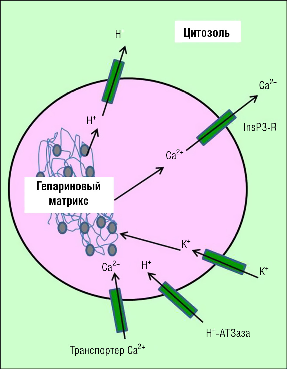 Процесс экспортирования медиаторов при активации ТК разные исследователи называют по-разному: одни называют его регулируемым экзоцитозом [36, 37], другие различают дегрануляцию, экзоцитоз и молекулярный способ [37]. Тем не менее все ученые сходятся во мнении, что существует множество форм секретирования медиаторов во внешнюю среду, которые могут реализовываться как по отдельности, так и одновременно в одной и той же ТК [37, 38]. Понимание регуляции экзоцитоза в ТК осложняется наличием во всех тканях млекопитающих гранул различных субпопуляций, тогда как ТК с полностью однородными гранулами встречаются значительно реже. При активации ТК индуцируются гомо- и гетеротипический процессы слияния мембран, которые зависят от специфического взаимодействия комплекса белков, входящих в состав мембран, механизма, сохраняющегося в эволюции от дрожжей до человека. В процессах везикулярного транспорта участвуют ионы кальция (Са+2) и комплекс семейств интегральных мембранных белков: SNARE (soluble NSF attachment protein SNARE — SNAP receptor SNX — Sorting nexins), Munc (аббревиатура от «нескоординированных-18» млекопитающих), NSF (N-этилмалеимид-чувствительный фактор) и VAMP (vesicle-associated membrane protein) [32]. Ранее уже было указано, что большую роль в процессах дегрануляции/экзоцитоза, гранулолизиса и синтеза новых медиаторов в ТК играют ионы кальция. Определено, что при активации ТК Ca2+ начинают входить в клетку через кальциевые каналы плазматической мембраны, важными источниками и резервуарами Ca2+ являются эндоплазматическая сеть, муциновые гранулы и липидные тельца [32, 34]. Используя флюоресцентные методы и цифровую сканирующую технику, на изолированных ТК и гранулах линейных мышей (CB/J и Bgj/Bgj), I. Questrada et al. (2003) установили, что наиболее важным источником Ca2+ и других катионов является полианионная, гепариновая, гелевая матриксная сеть гранул. Этим исследователям удалось показать, что гепариновый матрикс способен функционировать как эффективные ионообменные смолы, контролируя оборот связанных/свободных катионов, таких как Ca2+, K+ и H+, необходимых для процессов дегрануляции/экзоцитоза, гранулолизиса и синтеза медиаторов (рис. 4) [9].