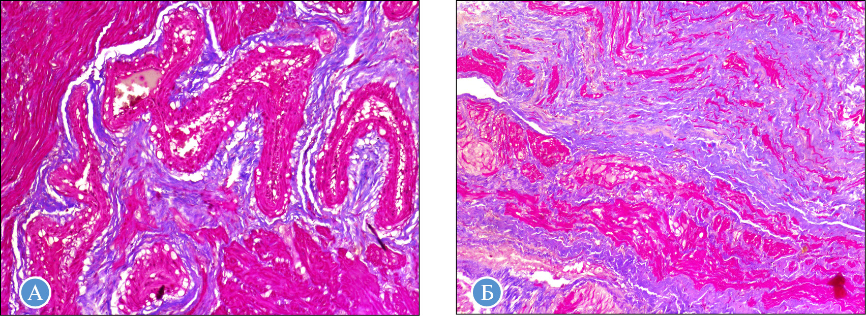 В нашем исследовании морфологический анализ носил обзорный характер, в связи с чем были использованы методы окрашивания гематоксилином и эозином по Ван Гизону и по Масону.