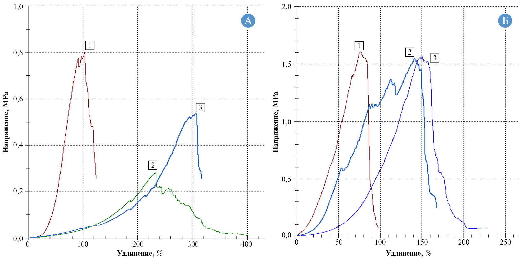 Рис. 4. Характерные деформационные кривые несостоятельного (А) и состоятельного (Б) рубца. 1–3 — количество полосок, которые были получены из одного биоптата (образца) рубцовой ткани