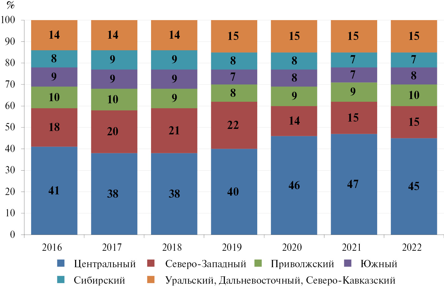Рис. 2. Соотношение распределения мигрантов по федеральным округам Российской Федерации, 2016–2022 гг., %