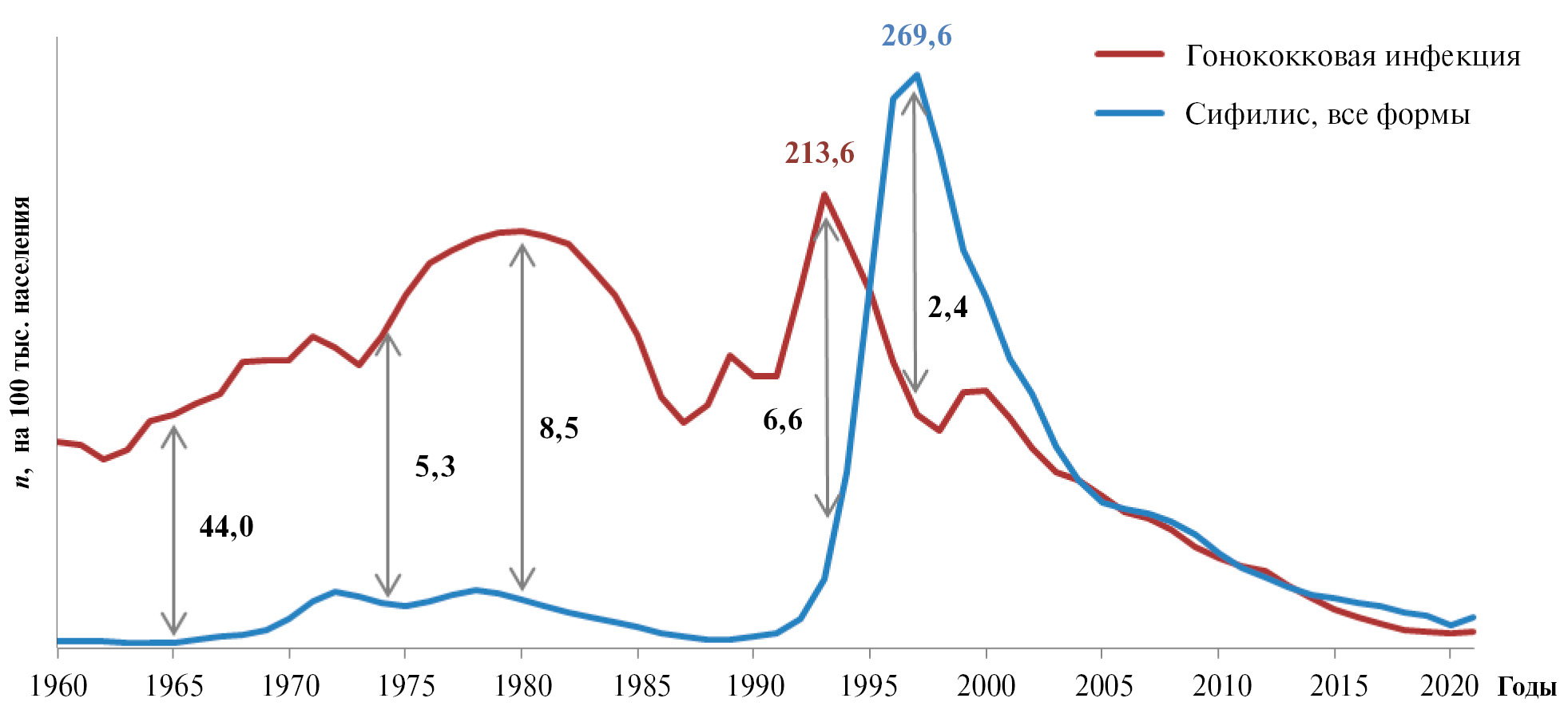 Рис. 5. Диапазон заболеваемости сифилисом / гонококковой инфекцией, 1960–2020 гг., на 100 тыс. населения