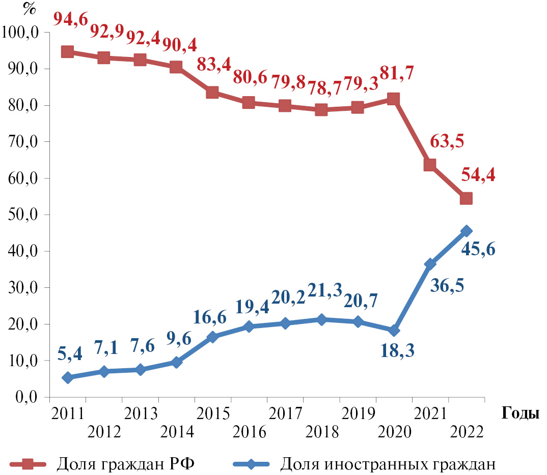 Детальный анализ структуры заболеваемости сифилисом в 2011–2022 гг. продемонстрировал рост доли больных сифилисом среди иностранных граждан на фоне снижения доли больных сифилисом граждан Российской Федерации. Если в 2011 г. процент больных сифилисом мигрантов составлял 5,4%, а 94,6% приходилось на долю больных сифилисом граждан России, то в 2022 г. процентное соотношение изменилось, составив почти 1:1 (45,6% больных сифилисом мигрантов и 54,4% больных сифилисом граждан России) (рис. 7).