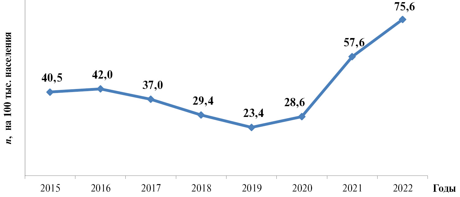 Как было представлено ранее, прибывшие в страну мигранты при оформлении разрешительных документов на временное пребывание на территории страны проходят медицинский осмотр, включающий обследование на сифилис. Анализируя количество фактов постановки на миграционный учет иностранных граждан, приведенных в сводке основных показателей деятельности по миграционной ситуации в Российской Федерации за 2015–2022 гг., и число случаев сифилиса, выявленных у иностранных граждан, можно рассчитать показатель заболеваемости среди данной категории граждан. В 2022 г. заболеваемость среди них составила 75,6 случая на 100 тыс. прибывших в страну иностранных граждан и поставленных на миграционный учет, что на 86,7% выше аналогичного показателя 2015 г. (рис. 8).
