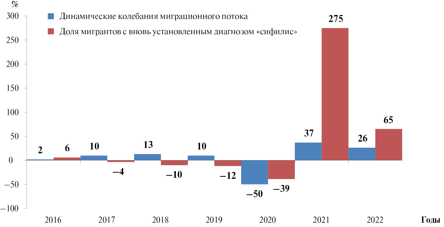 Рис. 9. Динамические изменения доли прибывших мигрантов к доле мигрантов с вновь установленным диагнозом «сифилис», 2016–2022 гг., %