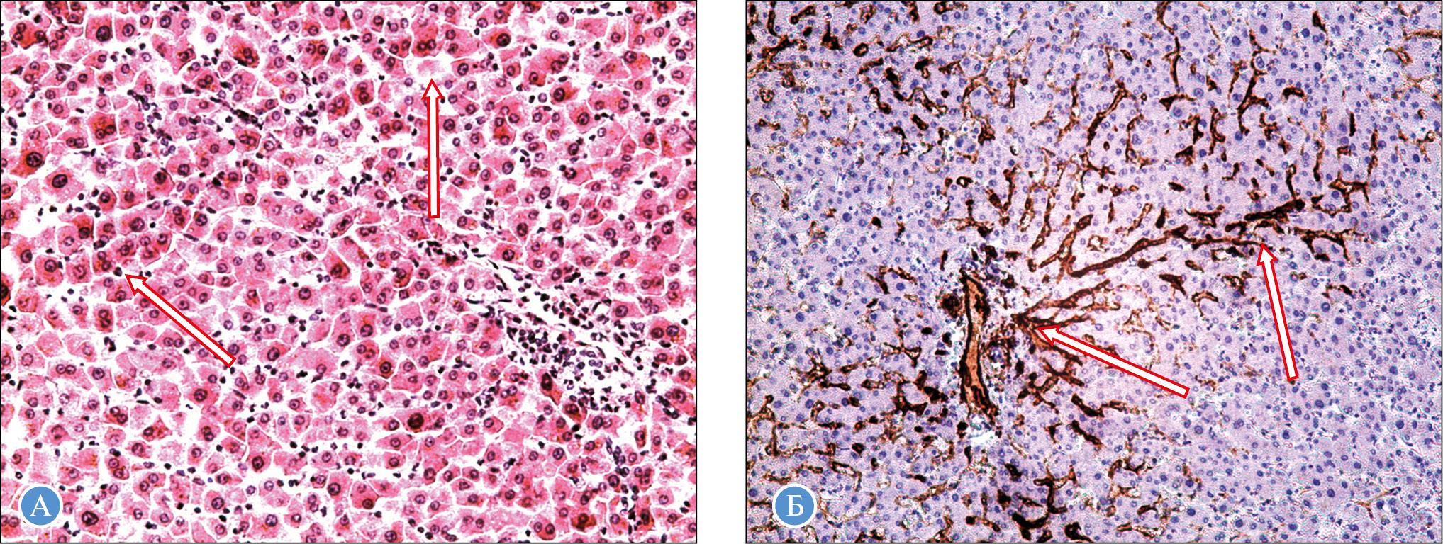 Рис. 1. Группа сравнения: А — наличие гипертрофированных двуядерных гепатоцитов (стрелки) в перипортальной области (зона 1 ацинуса) (патоморфологическое исследование, окраска гематоксилином и эозином, ×100); Б — разветвленная капиллярная сеть (стрелки) в зоне 1 и отчасти в зоне 2 ацинусов (иммуногистохимическое исследование с маркером CD-34, ×50)