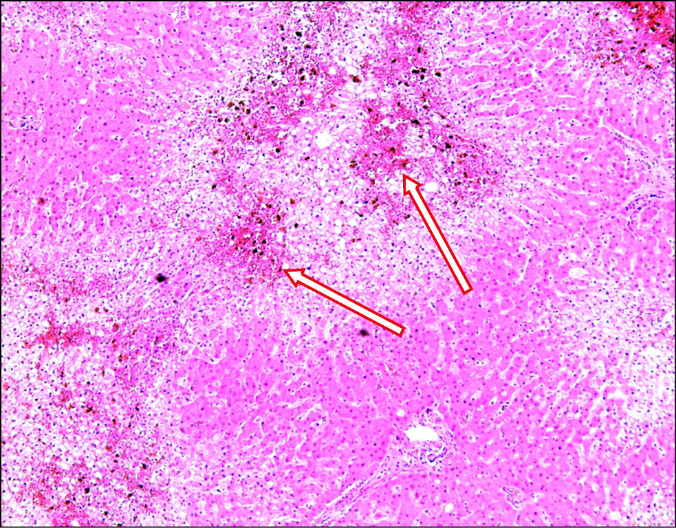 Рис. 2. Эклампсия — основная группа: тотальные некрозы гепатоцитов и очаговые кровоизлияния (стрелки) в трех зонах печеночного ацинуса (патоморфологическое исследование, окраска гематоксилином и эозином, ×50)