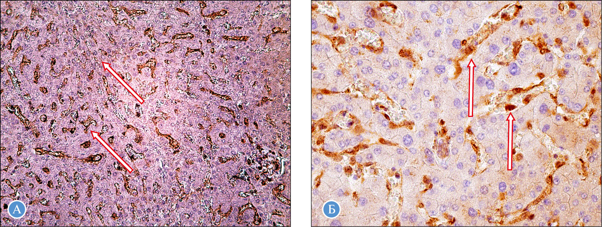 При иммуногистохимическом исследовании с иcполь-зованием маркера эндотелиоцитов CD-34 выявлен характерный дефицит капиллярной сети преимущественно в зоне 2 печеночного ацинуса (рис. 3, А), что соответствовало преобладающей там локализации очагов некроза.