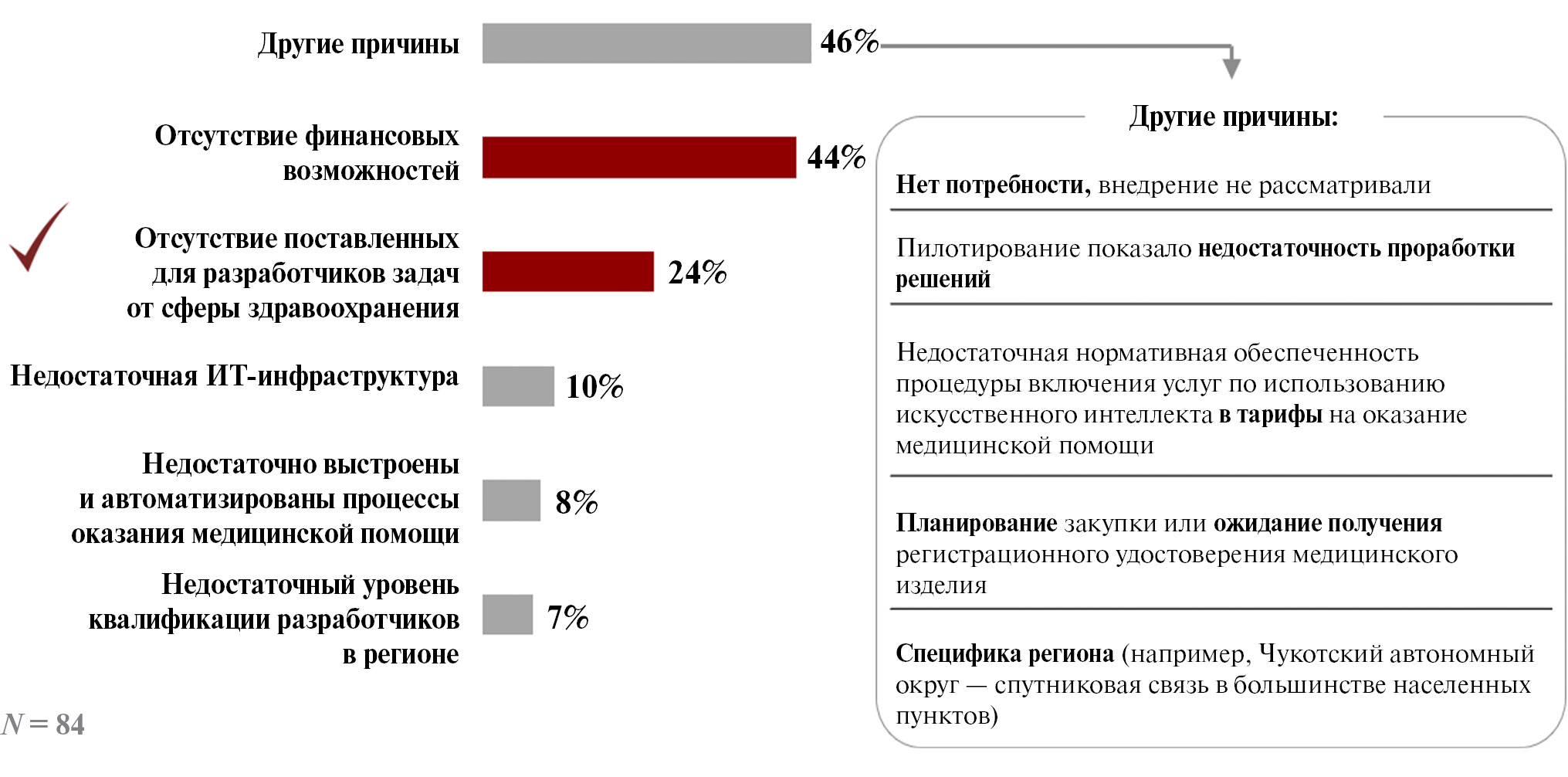 По результатам проведенного исследования 46% регионов сообщили о других причинах, которые не были включены в опросный список. К таким причинам относили: отсутствие потребности, недостаточность проработки решений и нормативной обеспеченности процедуры включения услуг по использованию ИИ в тарифы на оказание медицинской помощи, ожидание получения регистрационного удостоверения медицинского изделия поставщиком сервиса с ИИ и специфику региона (например, использование спутниковой связи в большинстве населенных пунктов). Далее в рейтинге причин замедления внедрения сервисов с ИИ в региональную практику здравоохранения является отсутствие финансовых возможностей — 44% регионов указали эту причину. 24% регионов отметили следующую причину в рейтинге, которая связана с отсутствием поставленных задач для разработчиков от сферы здравоохранения. Менее популярными причинами являлись недостаточная ИТ-инфраструктура, не в полной мере выстроенные и автоматизированные процессы оказания медицинской помощи и низкий уровень квалификации разработчиков в регионе, эти причины обозначили соответственно 10, 8 и 7% регионов.