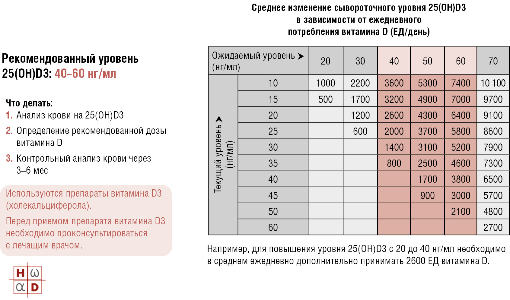 Рис. 1. Расчет необходимой суточной дозы витамина D в зависимости от его уровня в сыворотке крови для взрослого человека массой тела 68 кг [27]