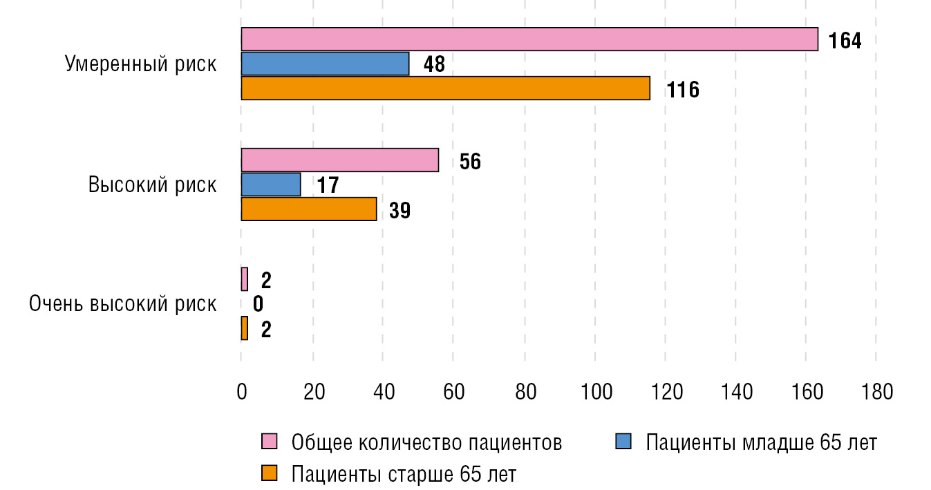 Ключевыми итогами применения системы поддержки принятия врачебных решений MedSafety Scan® являются расчет суммарного балла риска удлинения интервала QT и пируэтной тахикардии, а также присвоение соответствующей степени: отсутствие риска (0–8 баллов), умеренный (9–11 баллов), высокий (12–15 баллов) и очень высокий (16–20 баллов) риск. В первую очередь отметим, что 224 пациента из 500 (44,80%), находящихся на стационарном лечении в психиатрическом стационаре, имели риск удлинения интервала QT и развития пируэтной тахикардии. В то же время нами были выявлены статистически значимые различия (p < 0,05) между группой пациентов младше 65 лет — 65 (26%) пациентов и группой старше 65 — 157 (62,80%) пациентов. Распределение пациентов в зависимости от степени риска представлено на рис. 1.