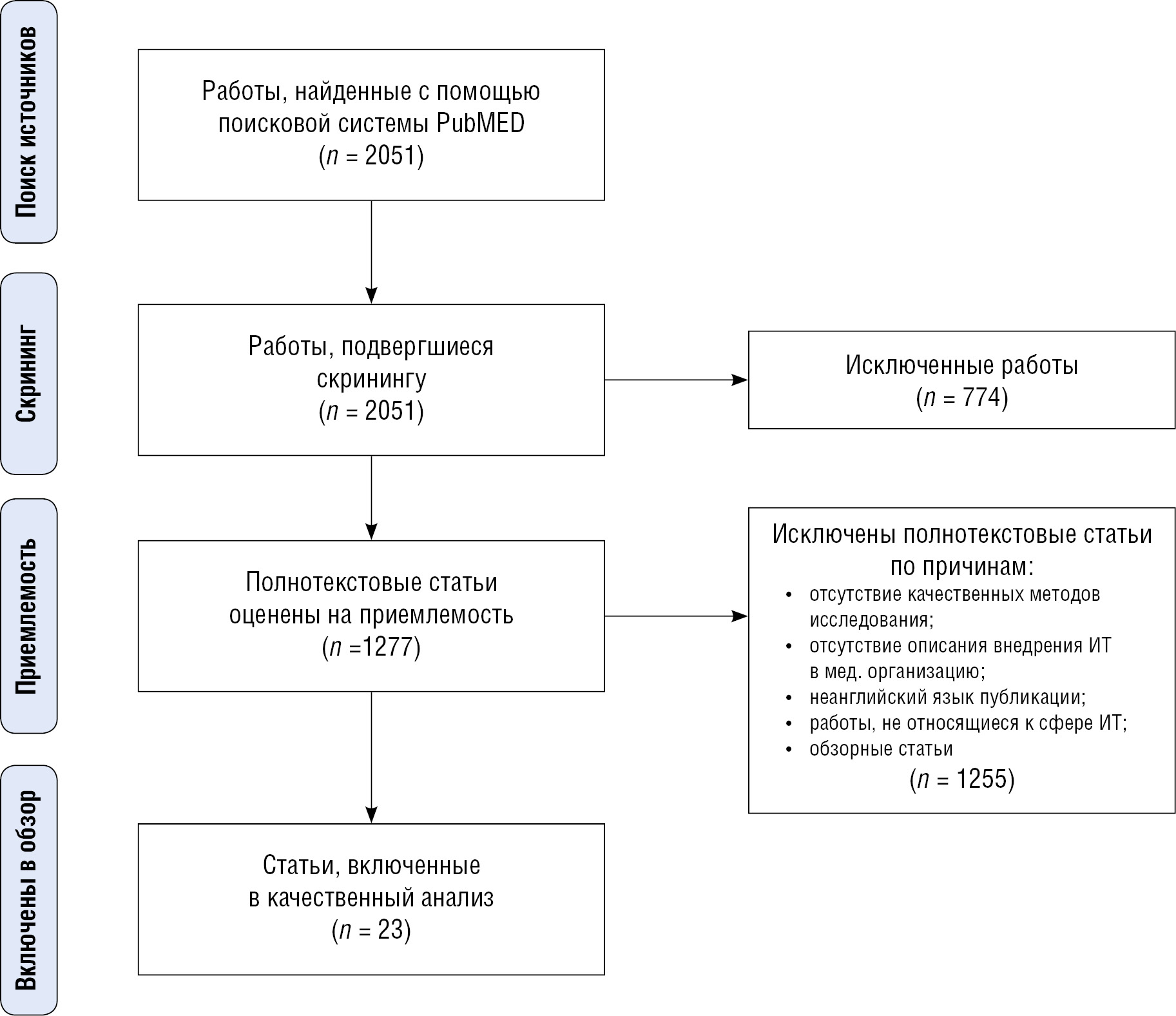 К настоящему моменту не было проведено масштабного и подробного анализа процессов внедрения различных ИТ-инноваций с целью поиска имеющихся закономерностей, а самое главное барьеров, которые могут уменьшить вероятность получения успешного результата [3, 4]. Поэтому наша команда исследователей приняла решение провести работу по обобщению современных данных по обозначенной теме в наиболее доказательном формате систематическом обзоре [5].