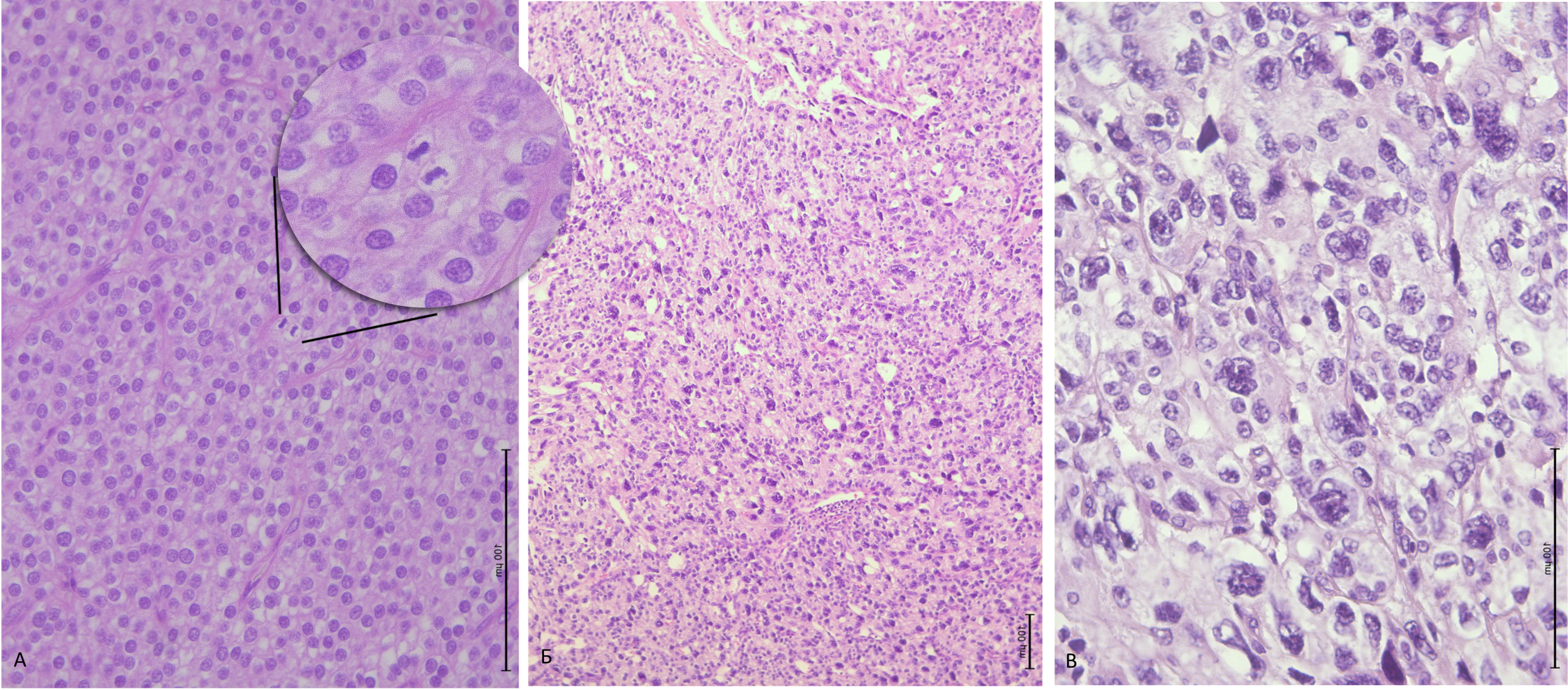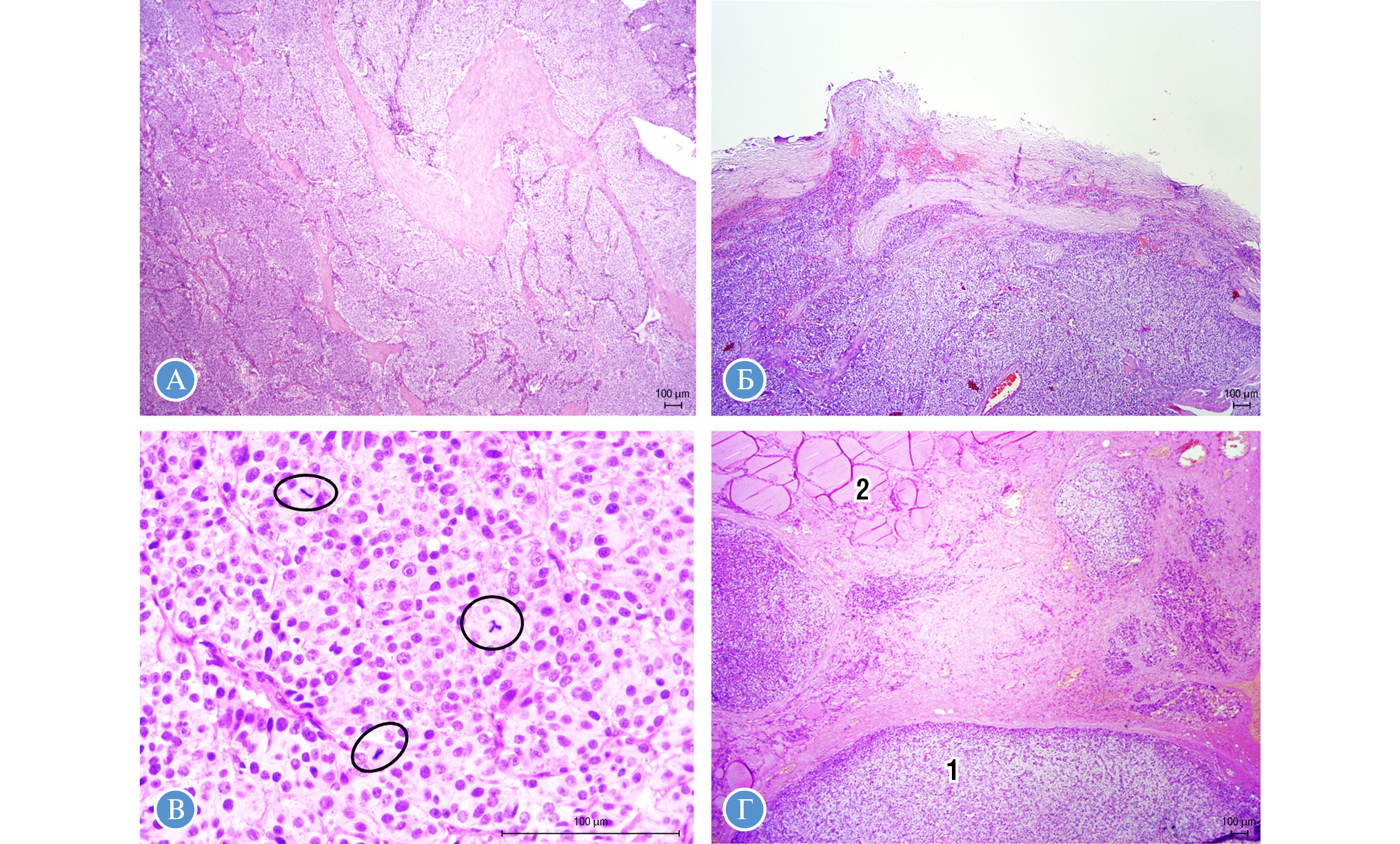 Классификация опухолей эндокринных органов Всемирной организации здравоохранения (ВОЗ) (4-е издание, 2017 г.) выделяет две категории новообразований ОЩЖ: аденому и рак [17]. Аденома ОЩЖ — доброкачественное новообразование, которое может состоять из главных клеток, онкоцитов или «переходных» онкоцитов, или иметь смешанный клеточный состав. Согласно критериям экспертов ВОЗ, к карциномам ОЩЖ следует относить новообразования с достоверными признаками инвазивного роста в прилежащие структуры (ЩЖ, мягкие ткани, сосуды капсулы и/или окружающих тканей, периневральные пространства) и/ или с наличием документированных метастазов [17]. Атипические аденомы ОЩЖ — опухоли, в которых отсутствуют достоверные признаки инвазивного роста, но есть морфологические изменения, подозрительные в отношении злокачественности. К таким критериям относятся: широкие фиброзные тяжи, митотическую активность, сращение с соседними структурами без прорастания в них, наличие опухолевых комплексов в окружающей аденому капсуле, солидный или трабекулярный тип строения, ядерная атипия, четкие ядрышки. Какое именно количество из перечисленных критериев необходимо для постановки диагноза «атипическая аденома ОЩЖ», экспертами четко не определено, в связи с этим на сегодняшний день эти новообразования остаются самой спорной группой. Классификация опухолей эндокринных органов ВОЗ не выделяет атипическую аденому в отдельную группу новообразований ОЩЖ и относит их к вариантам аденом. Указано, что большинство пациентов с данным диагнозом имеют хороший клинический прогноз, хоть и требуют более прицельного и длительного динамического наблюдения. В настоящее время опубликовано небольшое количество исследований с неоднозначными результатами, посвященных прогнозу данной когорты больных [8, 19].