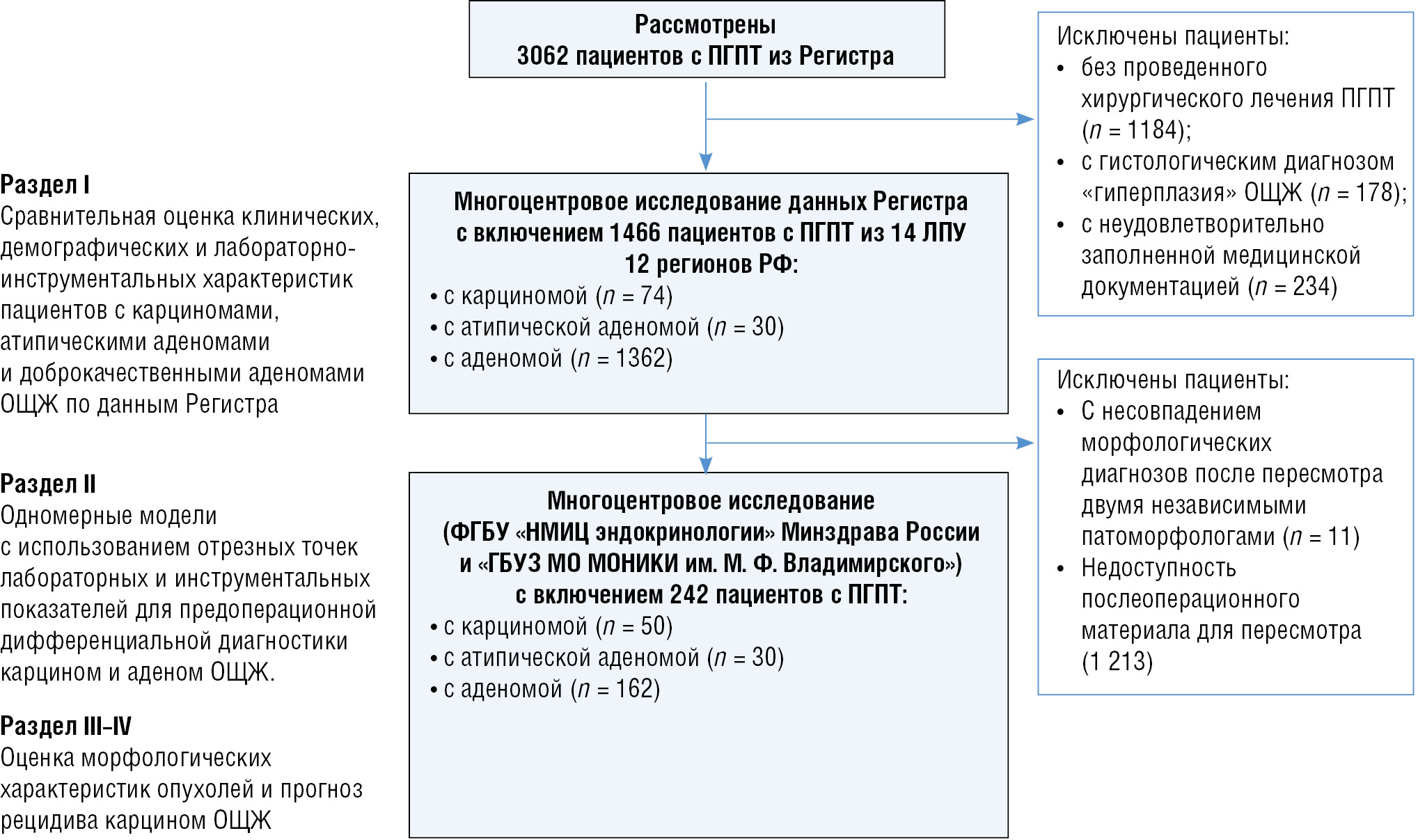 В ходе многоцентрового, одномоментного ретроспективного исследования проведен анализ демографических, клинических, лабораторных, инструментальных и морфологических показателей пациентов с диагнозами «карцинома», «атипическая аденома» и «аденома» ОЩЖ. Дизайн исследования представлен на рис. 1.