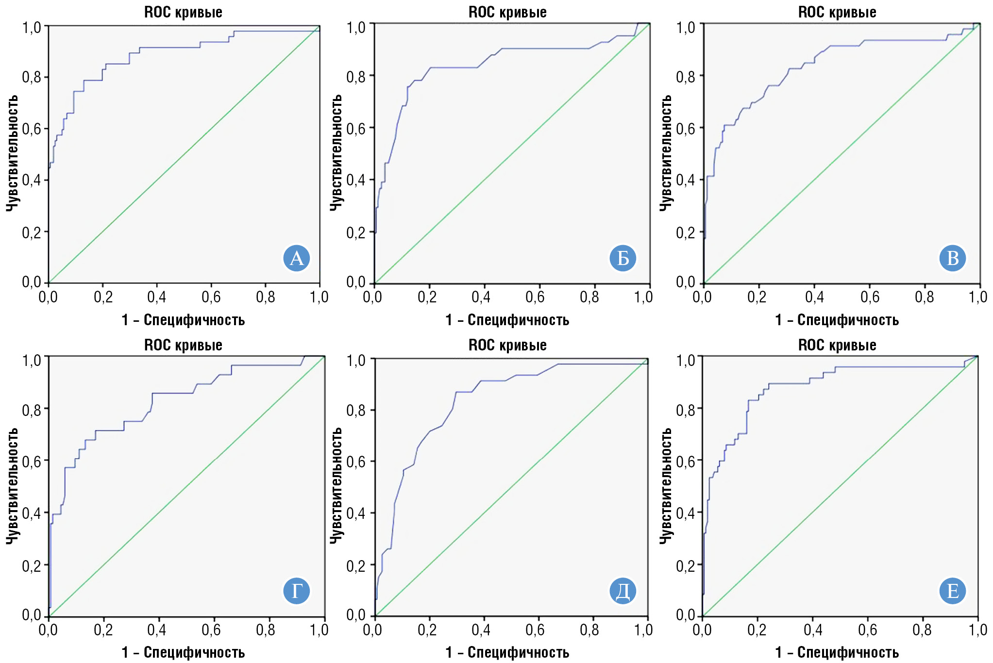 Методы статистического анализа данных. Статистический анализ проводили с использованием пакетов программ STATISTICA 13 (StatSoft, США, 2017 г.) и SPSS 26 (IBM, США, 2019 г.). Количественные данные представлены в виде медианы (Me), а также 1-го и 3-го квартилей [Q1; Q3], качественные — в виде абсолютных и относительных частот. Различия между двумя независимыми группами по количественным признакам оценивали с использованием критерия Манна–Уитни (U-тест). Сравнение трех независимых групп для количественных данных выполнялось с помощью критерия Краскела–Уоллиса. Для выявления критических значений отдельных параметров, показавших статистически значимые различия при сравнении групп пациентов с карциномами и аденомами, использовали ROC-анализ. Анализировали следующие параметры: AUC (площадь под ROC-кривой), диагностическая чувствительность (ДЧ), диагностическая специфичность (ДС), прогностическая ценность положительного результата (ПЦПР) и прогностическая ценность отрицательного результата (ПЦОР). Отрезная точка выбиралась с помощью критерия Юдена (сумма ДЧ и ДС должна была быть максимальной для данной точки). Частоты признаков сравнивались между собой с помощью критерия «хи-квадрат» (χ2). При необходимости применялась поправка Йетса. Критический уровень значимости при проверке статистических гипотез принимался равным 0,05. Для множественных сравнений применялась поправка Бонферрони.