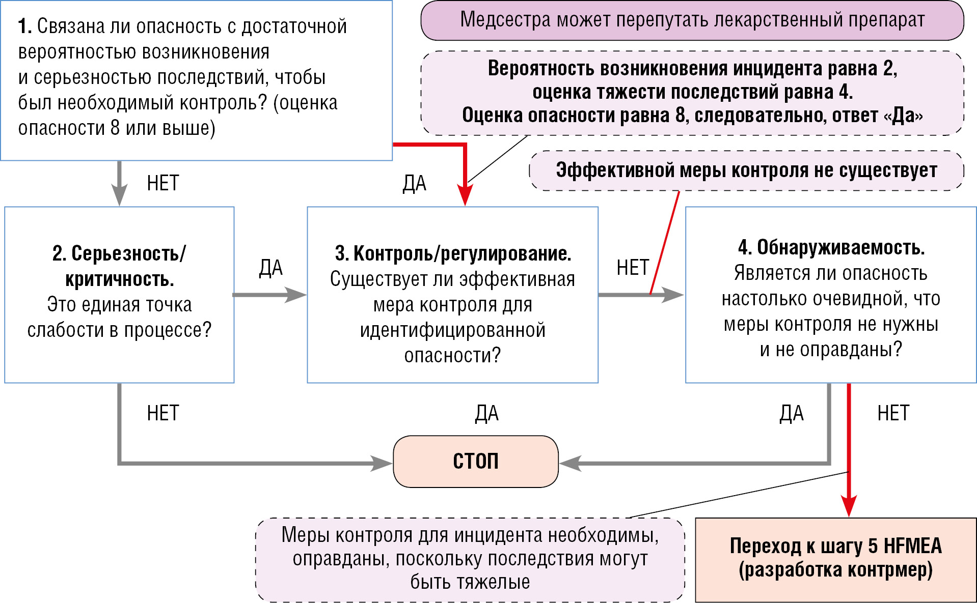 Еще одно существенное отличие HFMEA — оценка опасности вместо расчета числа приоритета риска, которая считывается из матрицы опасности, разработанной специально для этой цели [26]. Баллы матрицы кода оценки безопасности (security assessment code, SAC) для приоритизации событий варьируются от 1 до 16. При численном значении показателя опасности 8 и выше риск определяется как существенный, и каждое несоответствие проходит анализ через дерево решений HFMEA для выявления критичности, эффективности контроля и вероятности обнаружения [15, 16]. По ответам на вопросы по дереву решений НFMEA определяются либо необходимость и оправданность дальнейших действий для смягчения факторов риска, либо зоны, которые не требуют пристального внимания, поскольку они не столь критичны либо уже имеют эффективную меру контроля.