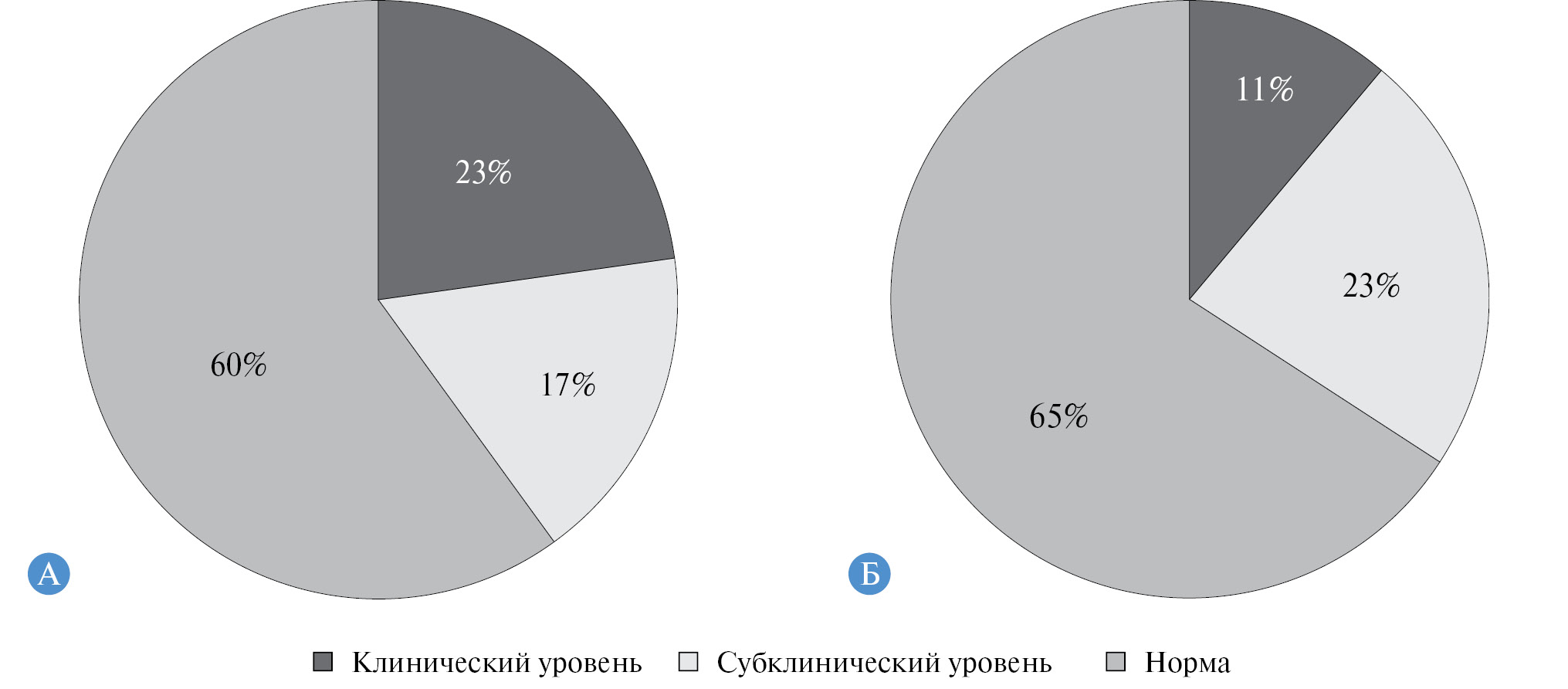Рис. 1. Распределение у врачей уровней тревоги (А) и депрессии (Б) по шкале HADS