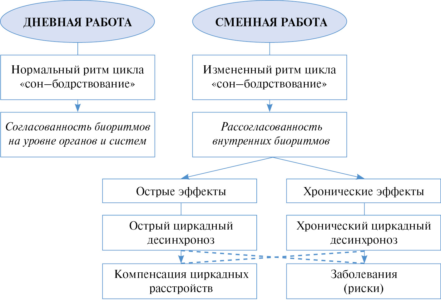 Детальное исследование воздействия сменной работы на человека выполняют в контролируемых экспериментальных исследованиях, используя протоколы многодневной имитации разных графиков дневных и ночных смен. Обнаружено влияние ночных смен на ключевые биологические процессы, включая иммунный ответ, опосредованный естественными клетками-киллерами. Выявлена циркадная дисрегуляция репарации ДНК после воздействия моделируемой ночной смены, что может увеличивать повреждение ДНК и повышать риск развития рака у работников, работающих в ночную смену. При разрыве циркадных ритмов (циркадном десинхронозе) с изменением экспрессии циркадных генов наблюдается нарушение эндотелиальной функции, эндотелий-зависимой релаксации и микроциркуляции, что объясняет, почему посменная работа может увеличить риск ИБС [62]. Кроме того, сменная работа может усилить стресс из-за нарушения нормальных метаболических и гормональных функций [5]. Чтобы его компенсировать, увеличивается секреция глюкокортикоидов и катехоламинов, а затем угнетается синтез гормонов щитовидной железы и др. [63]. Обнаружено, что нарушения (рассогласование, ослабление ритмичности) временной координации между транскриптомом и внешней средой со смещенными циклами сна/бодрствования наблюдаются после 4 дней имитации работы в ночную смену.